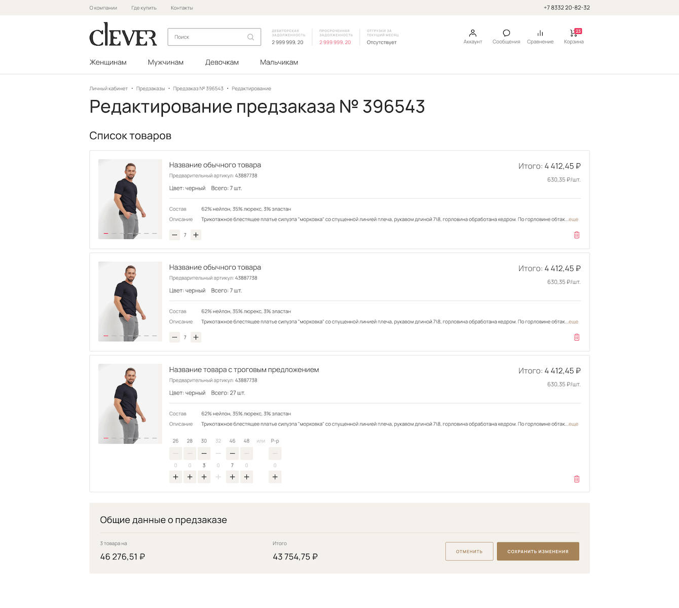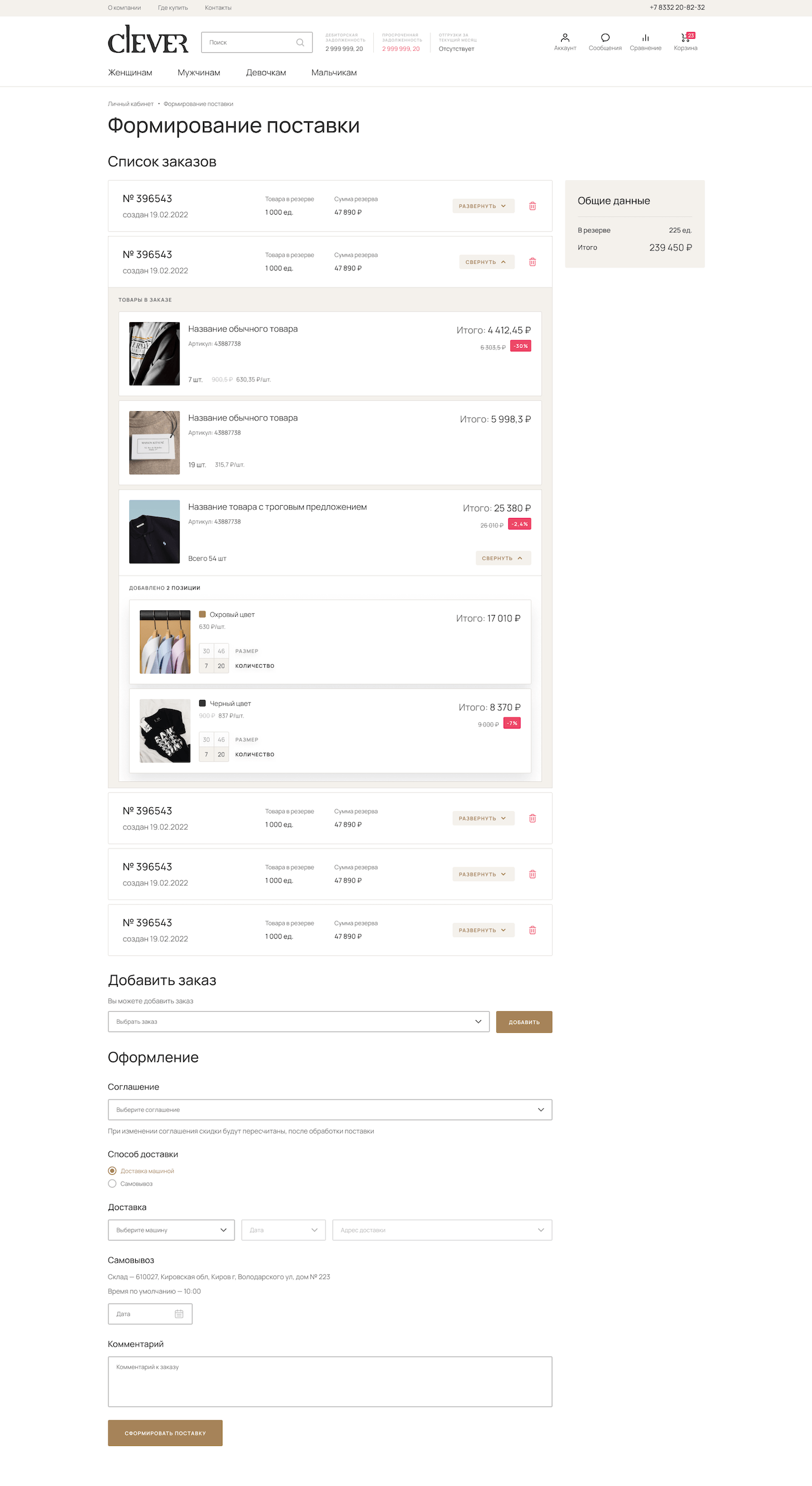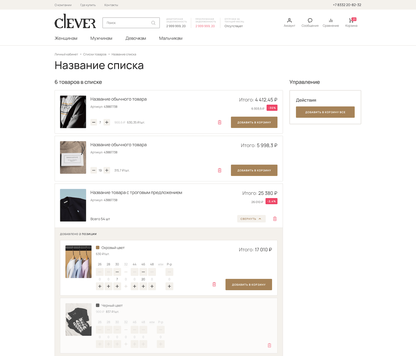 Для авторизованного пользователя есть возможность создавать неограниченное количество списков и добавлять туда избранные товары. В самом списке партнер может выбрать то количество товаров, нужного цвета и размера, которое ему необходимо добавить в корзину.