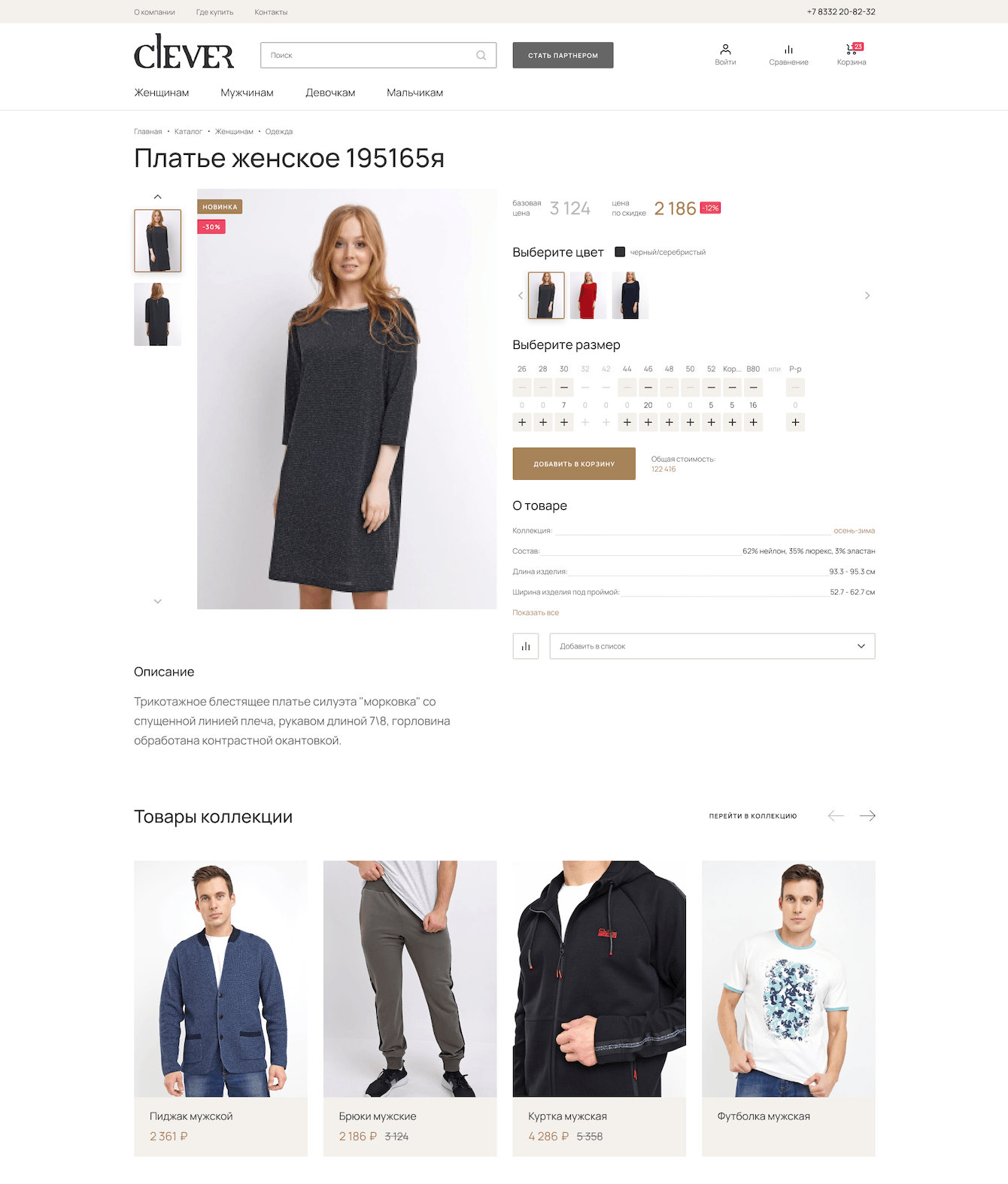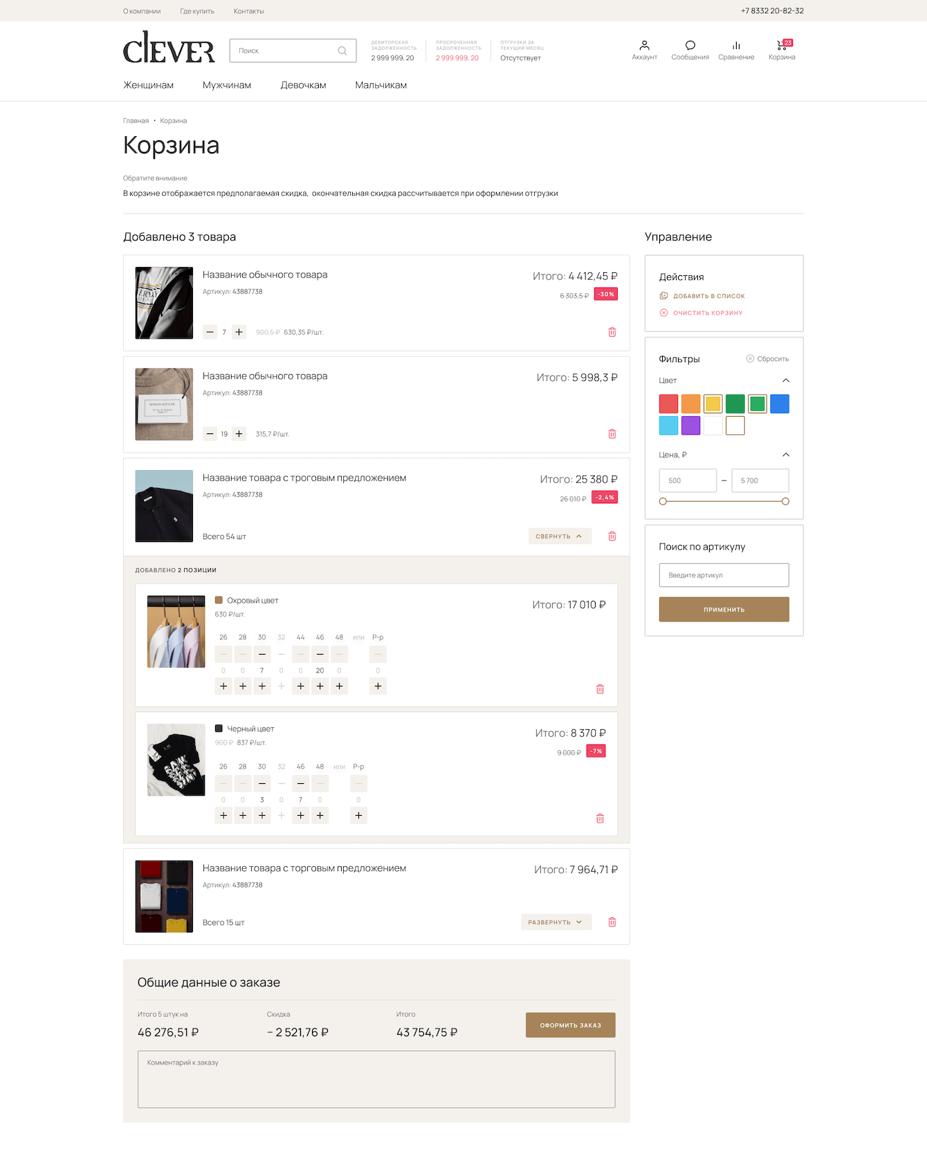 Товары и торговые предложения с актуальными остатками выгружаются из 1С Заказчика. Торговые предложения реализованы не по классической схеме, а в виде кастомного выбора цвета, размера и количества.