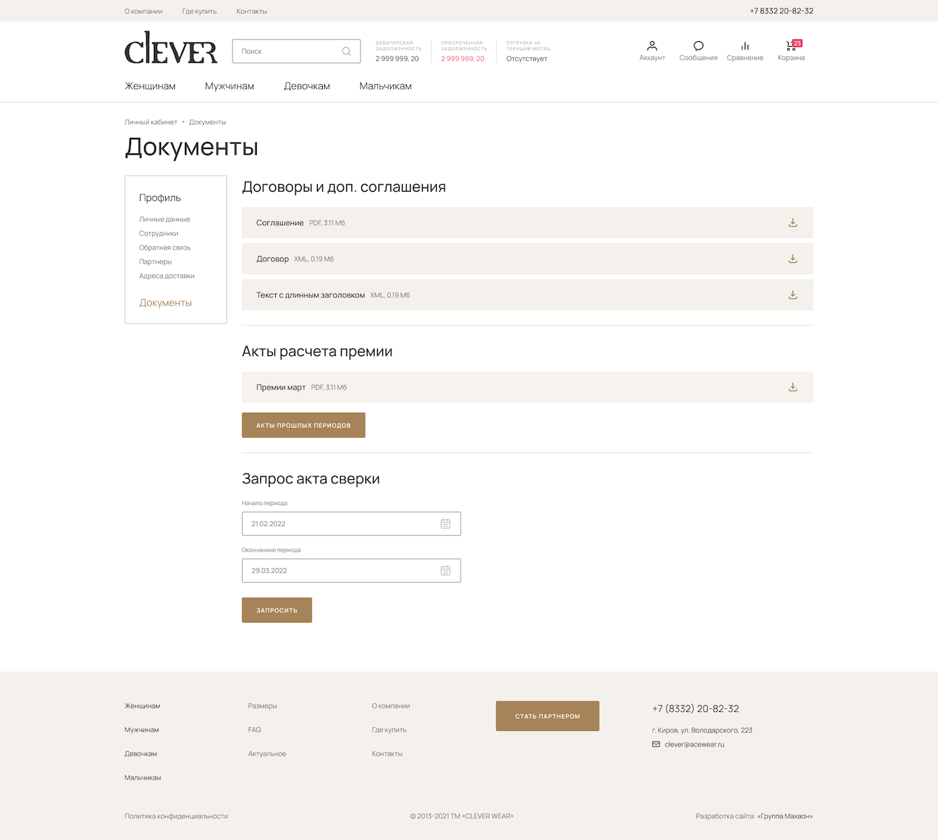 - документы: представлены договоры и соглашения, акты расчета премии. Они выгружаются из Битрикс24. Можно через форму запросить акты-сверки, запрос уйдет на e-mail менеджера.