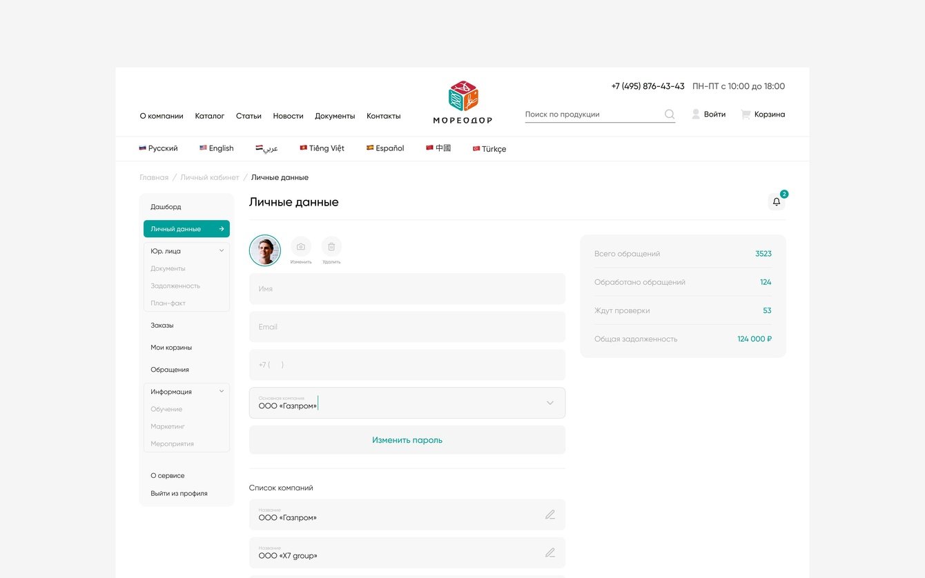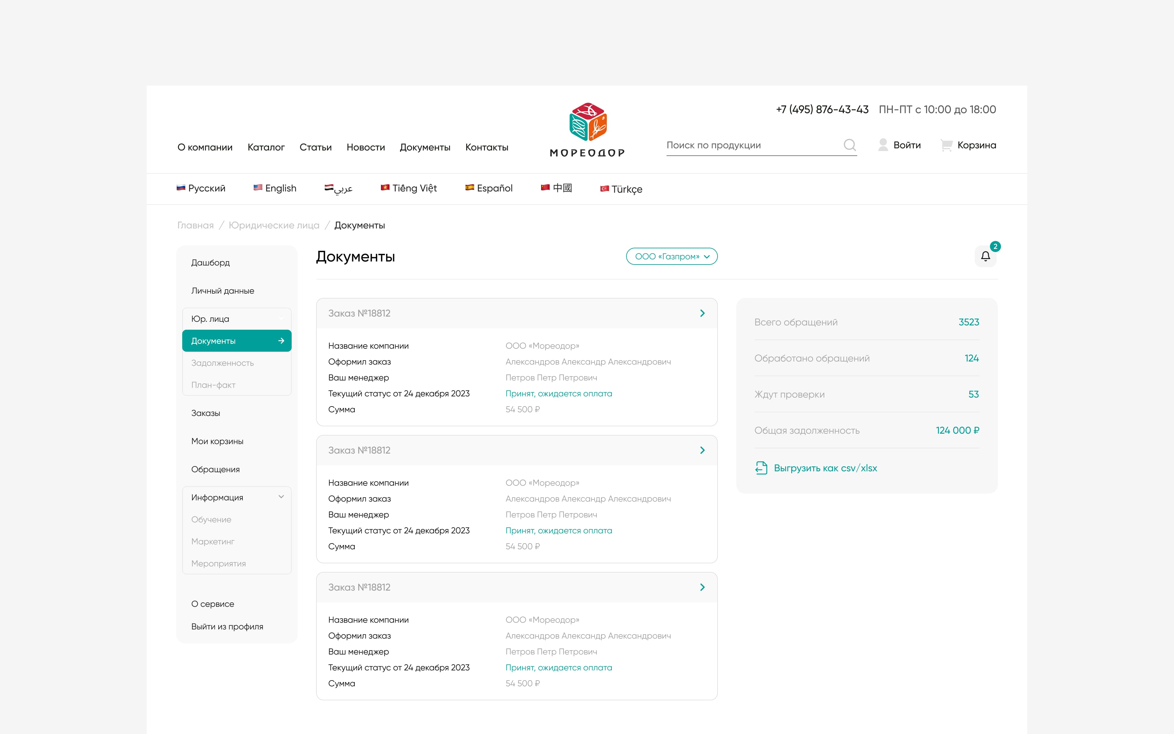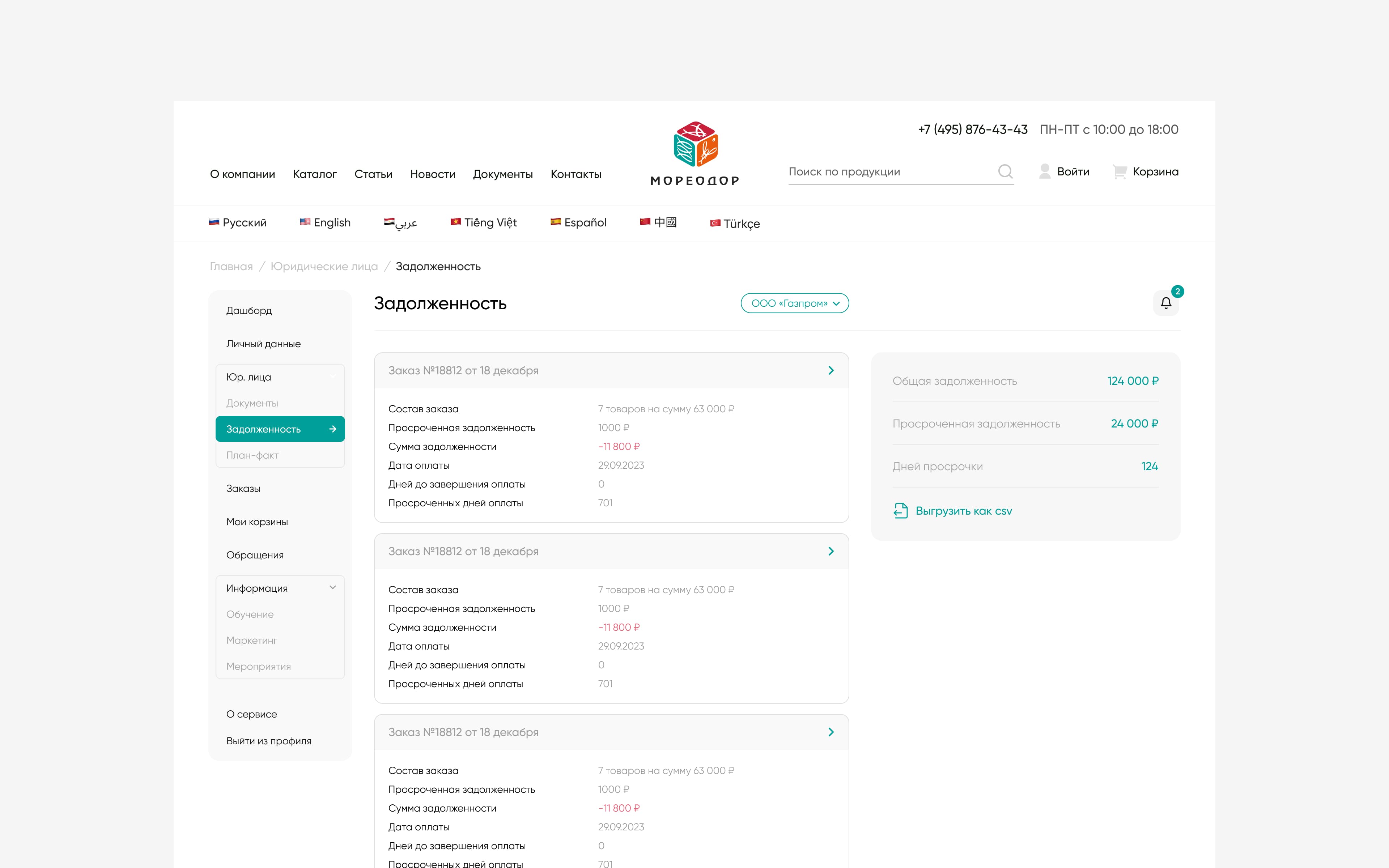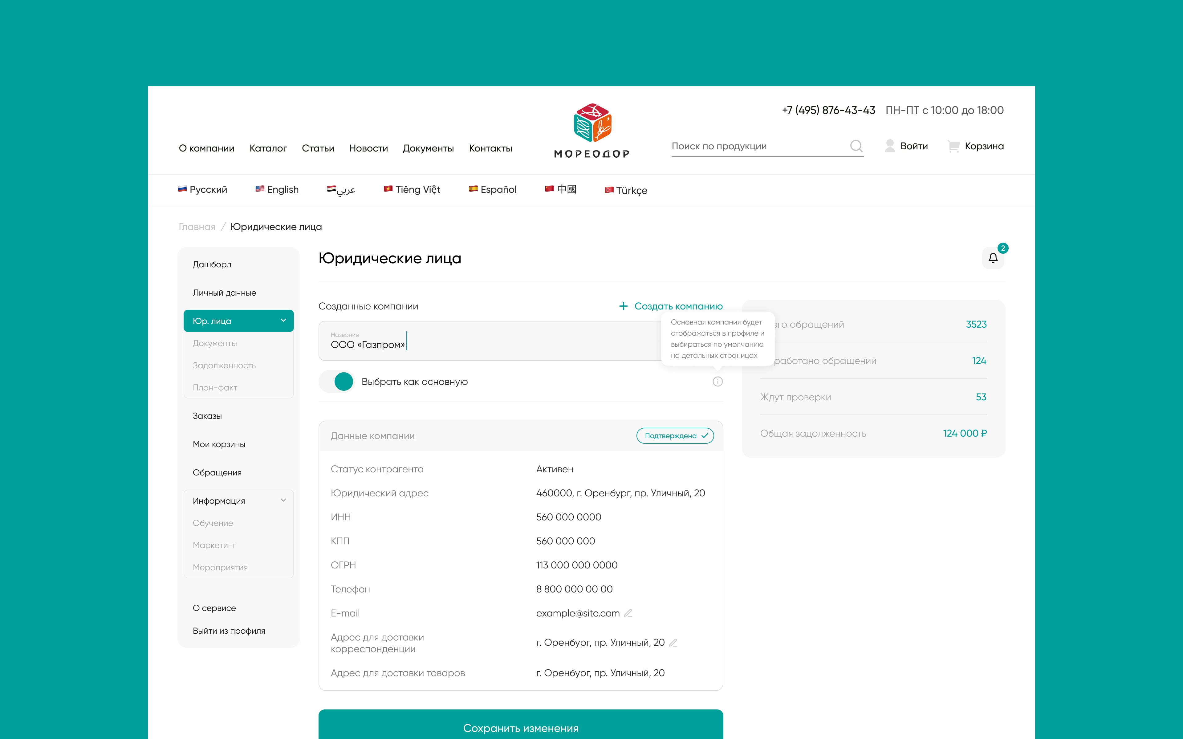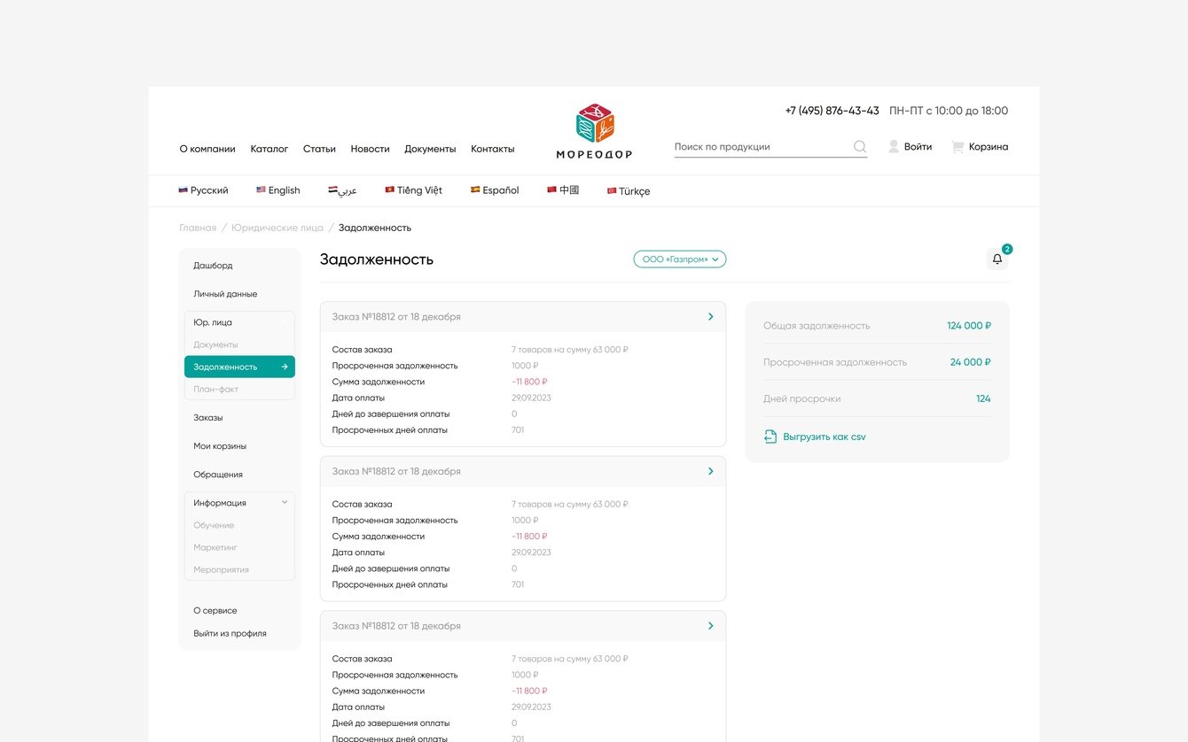 Интеграция с учетными системами позволяет синхронизировать данные о клиентах и заказах. Реализована работа с несколькими юрлицами: можно объединить перечень организаций под одного клиента с сохранением реквизитов для каждого.