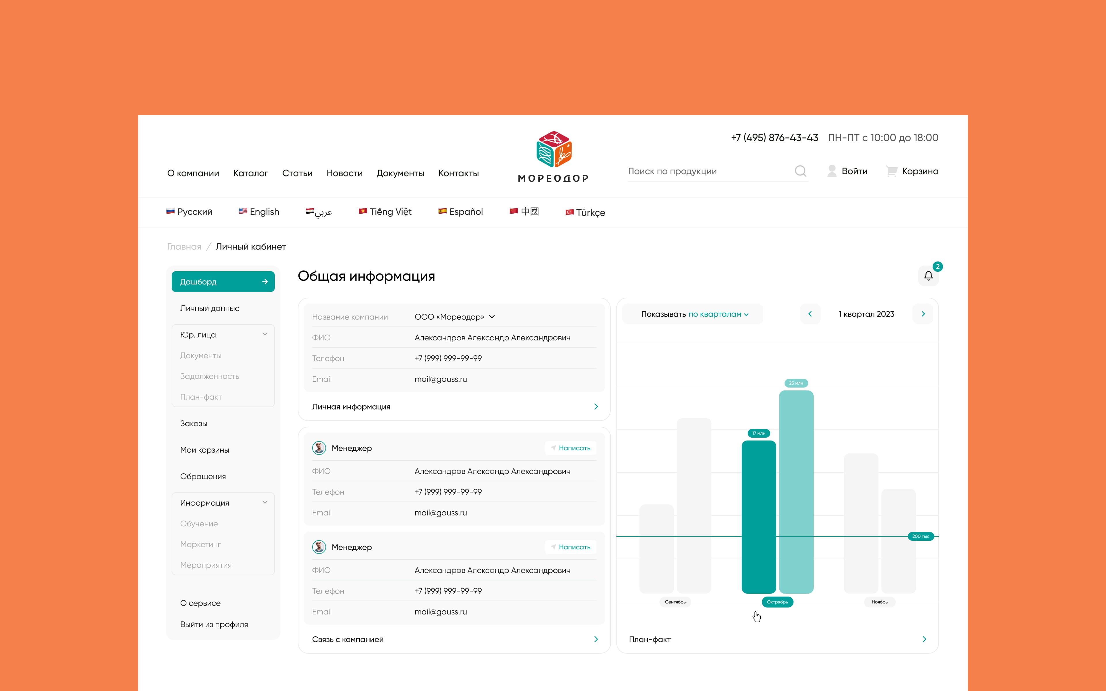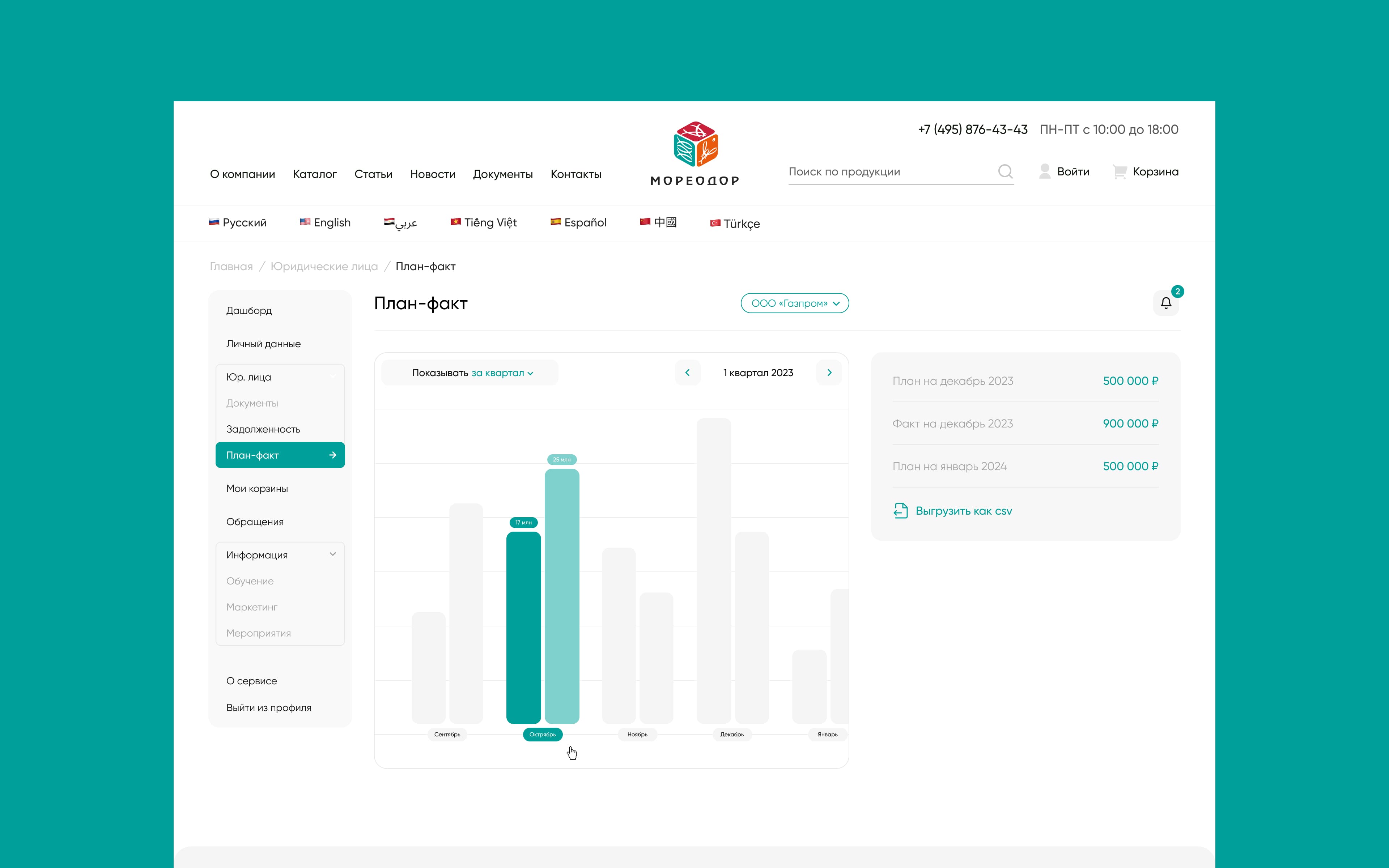 Система автоматически формирует счета, накладные, акты сверки, предоставляет данные о задолженностях и кредитных линиях. В личном кабинете клиенты и менеджеры могут отслеживать планы закупок и фактические заказы с визуализацией данных в виде графиков.