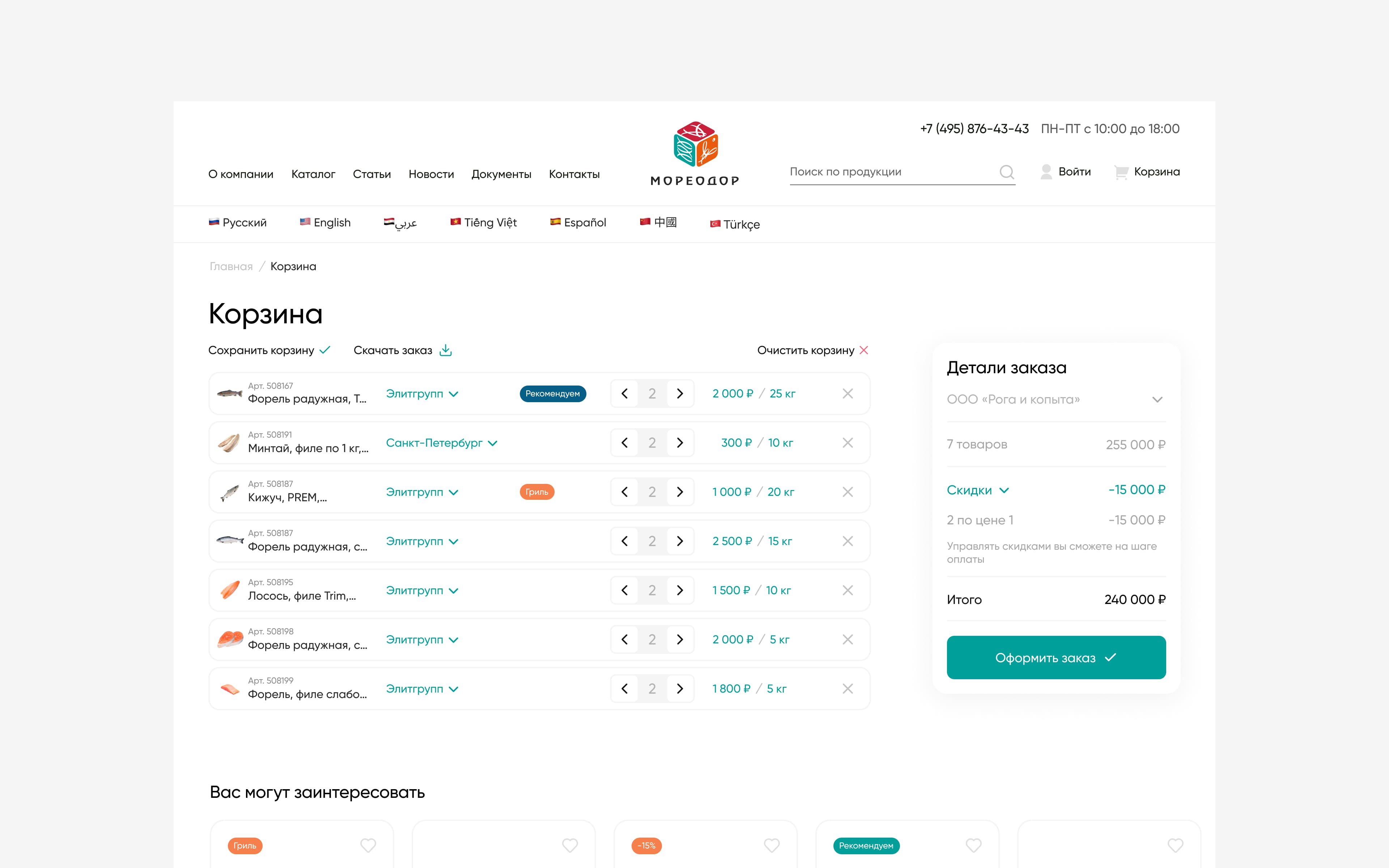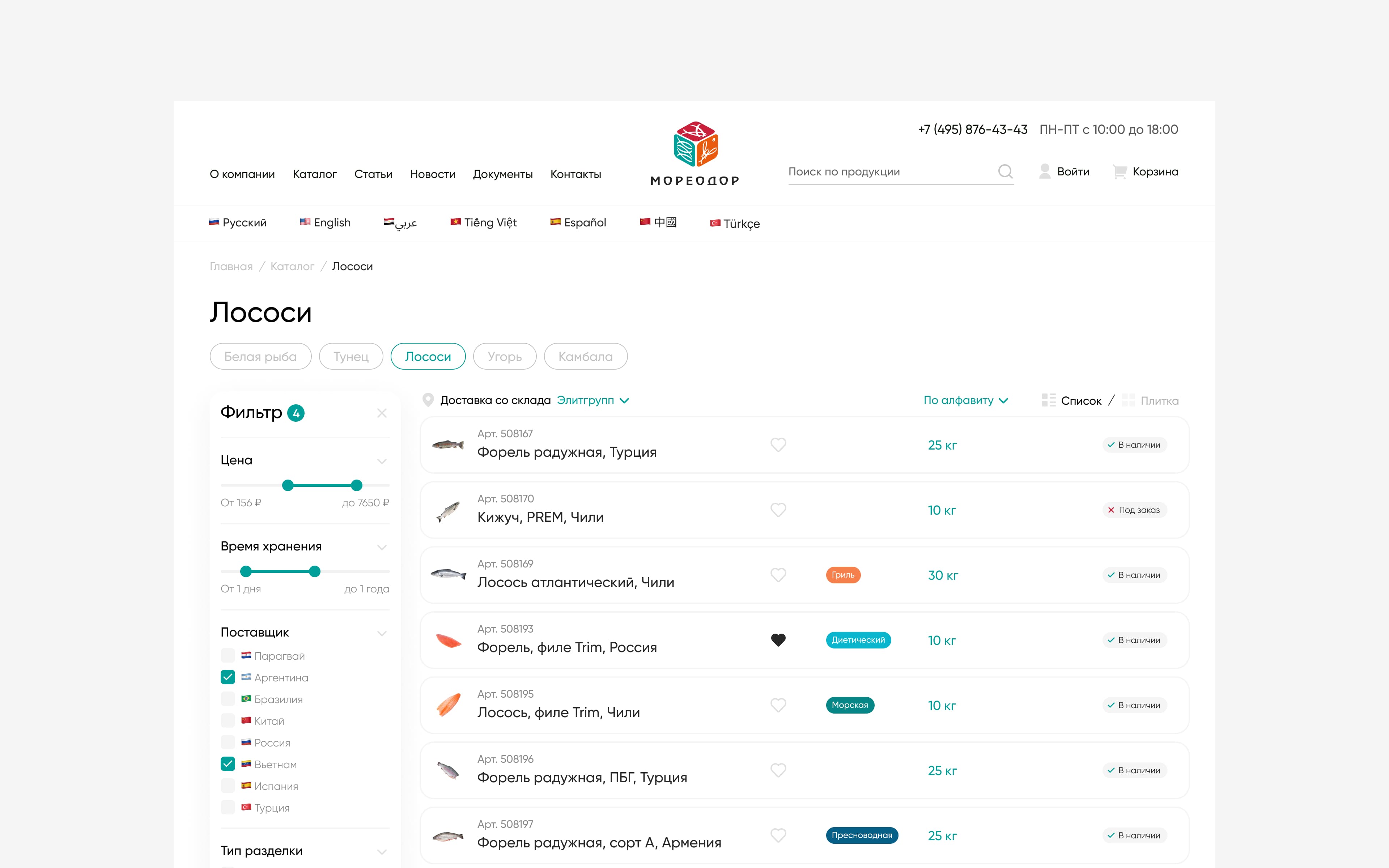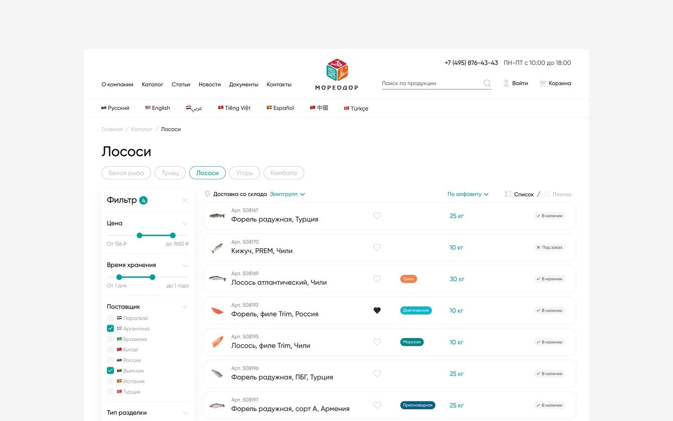 Мы спроектировали удобную навигацию и создали каталог с товарами в наличии и под заказ, добавили фильтры и сортировку. В карточках товаров предусмотрели ключевую информацию: технические характеристики, фотографии, рейтинги, блок рекомендованных товаров и справочник единиц измерения.