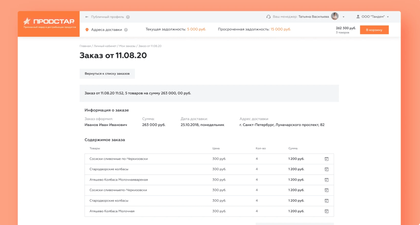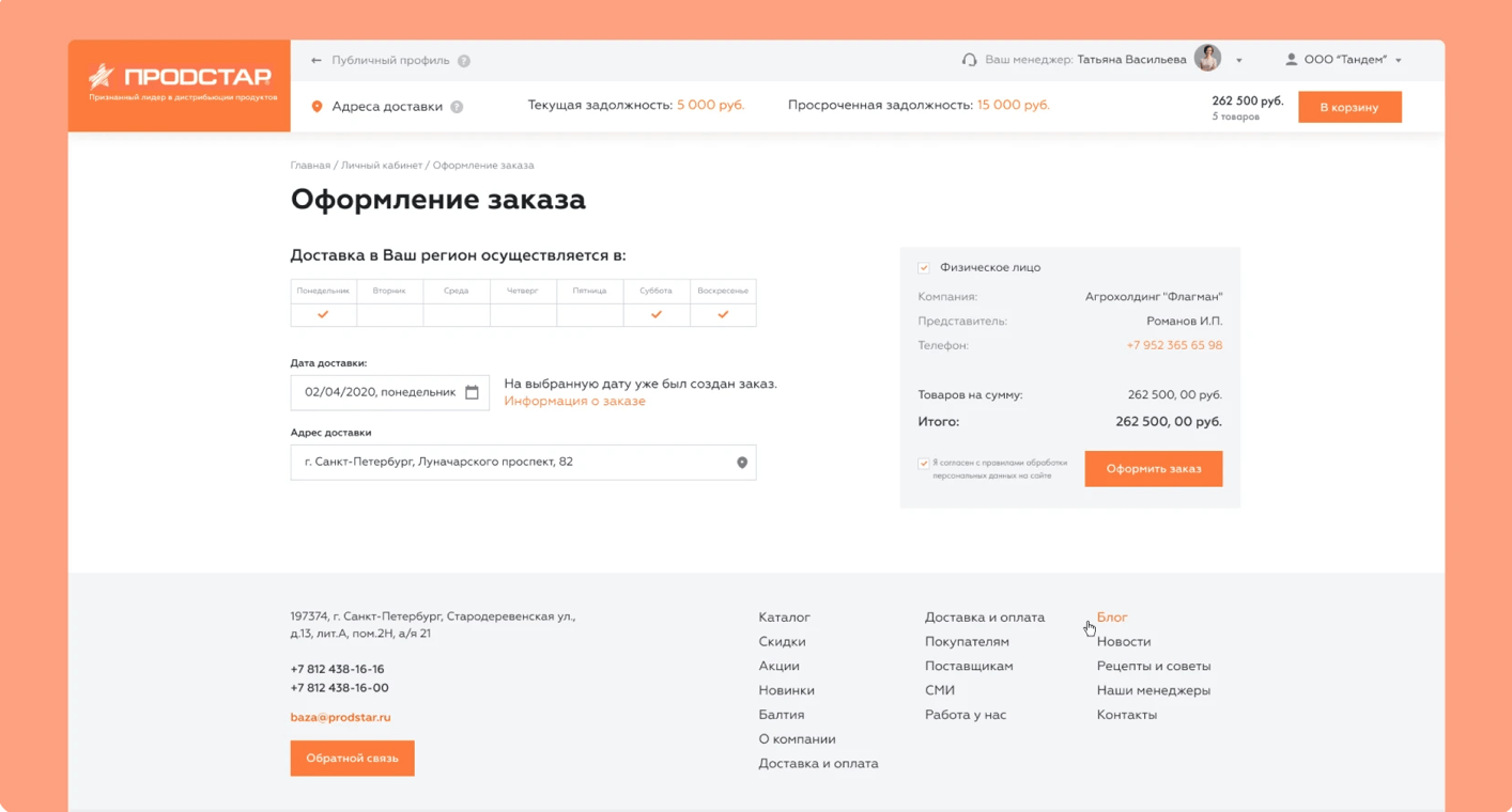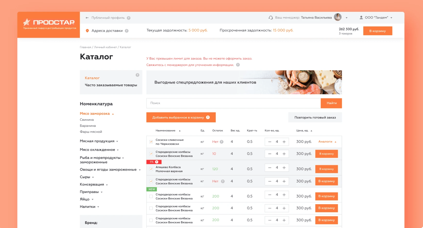 В личном кабинете пользователь получает возможность выбрать товар и оформить заказ, а также доступ к личной информации и истории покупок. При этом для каждой торговой точки рассчитываются свои цены. Также у юридического лица есть лимит — сумма, на которую он может сделать заказ на сайте. Лимит зависит от истории взаимоотношений с контрагентом и условий договора.