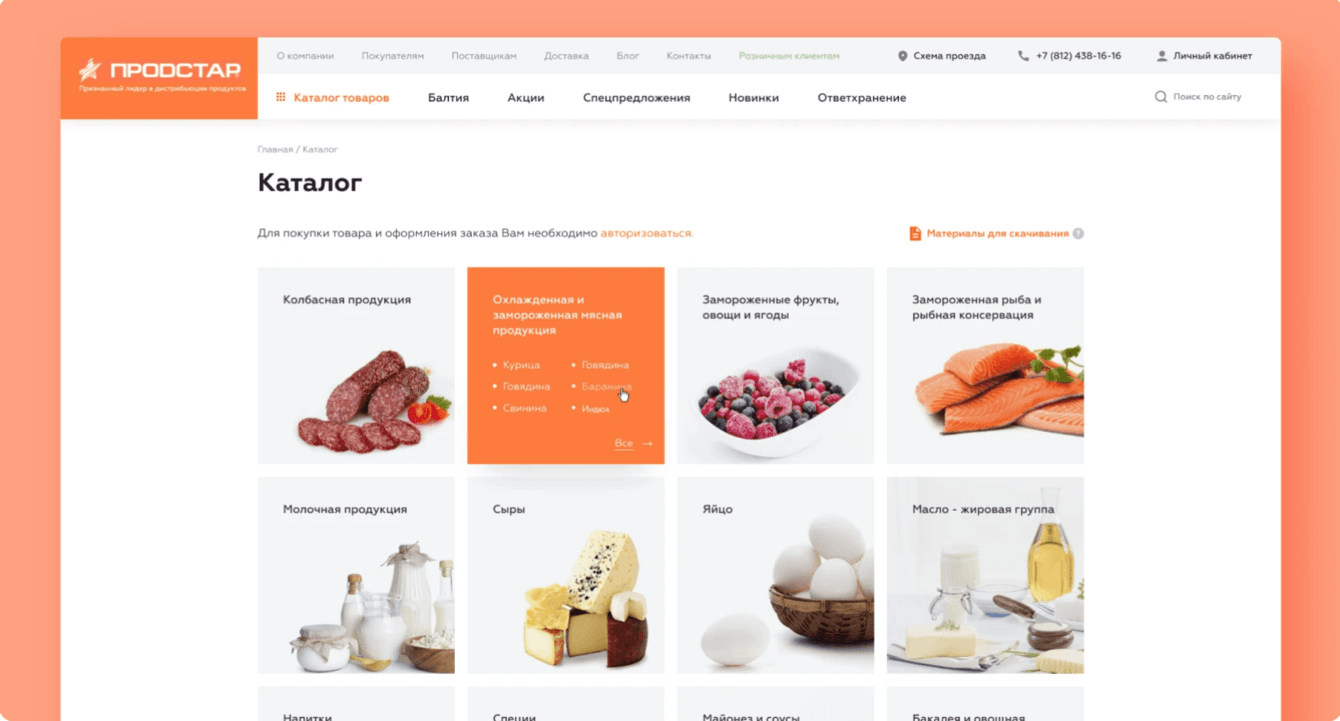 Отдельно на сайте выведен раздел «Балтия» — это продукция собственной торговой марки компании, под этим брендом «Продстар» выпускает мясные деликатесы и колбасы. Для лучшего продвижения товаров решено было сделать отдельную посадочную страницу.