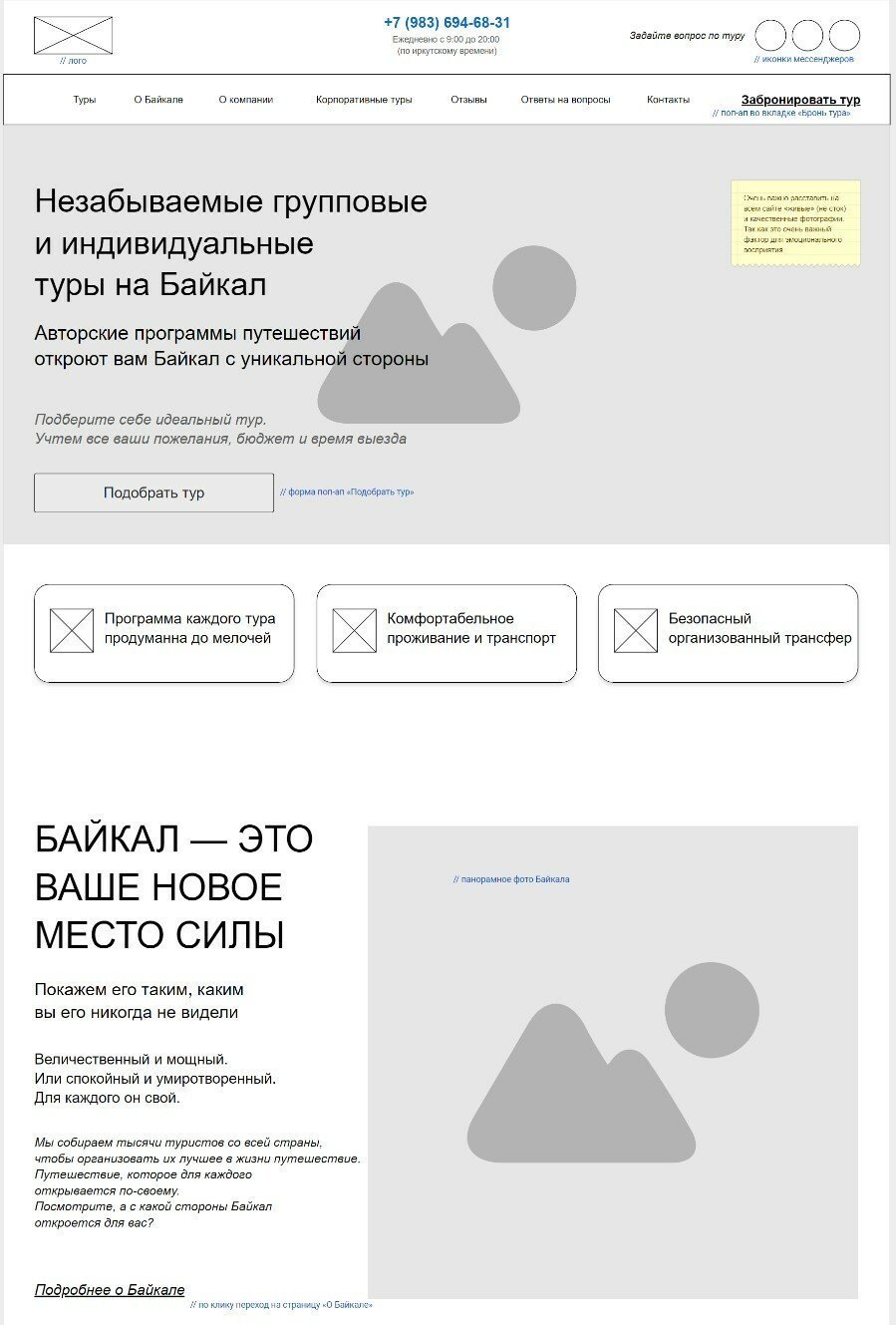 При разработке концепции сайта мы сосредоточились на эмоциях и стремились вызвать у целевой аудитории влюбленность в Байкал и привлечь их внимание к идее поездки туда. Мы изучили различные агрегаторы туров, анализировали отзывы и комментарии в социальных сетях, а также обратили внимание на форумы и отзовики, где представители целевой аудитории общаются.