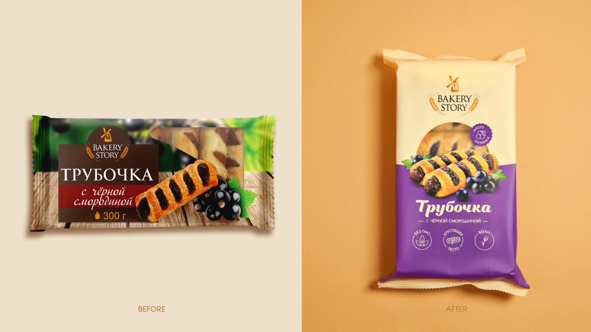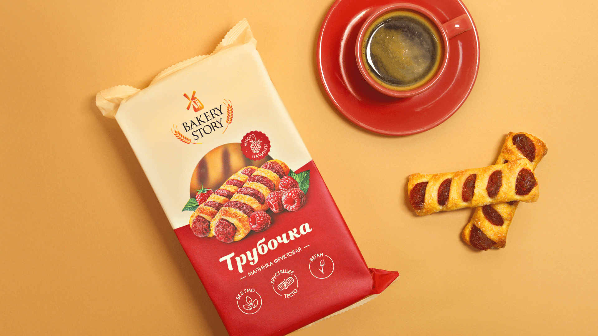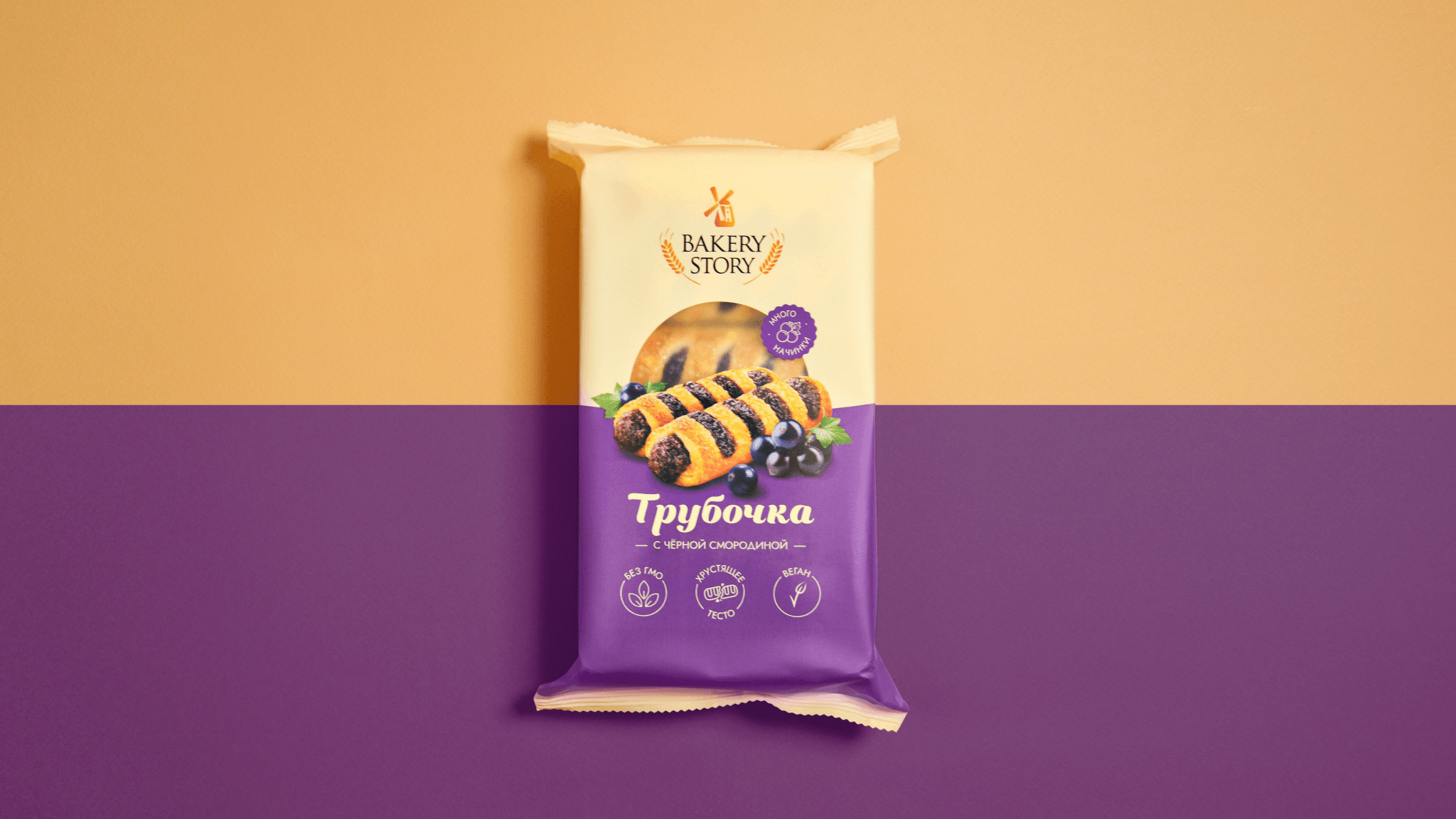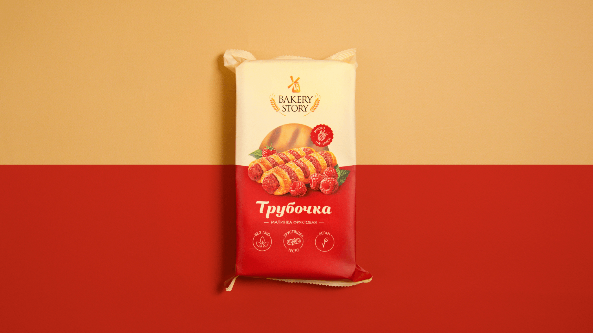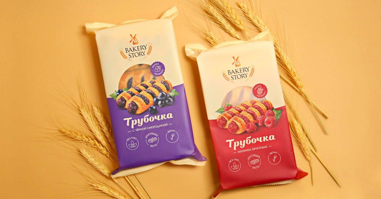 Фон делится на два цветовых блока: спокойный пастельный оттенок и акцентный яркий цвет, соответствующий вкусу. В центральной части расположены изображения двух аппетитных трубочек, наполненных ягодной начинкой, сочных ягод и клейм «Много начинки». Также в фуд-зоне через прозрачное «окошко» покупатель видит сам продукт. Это отражает значимую для «Bakery Story» ценность — честность.