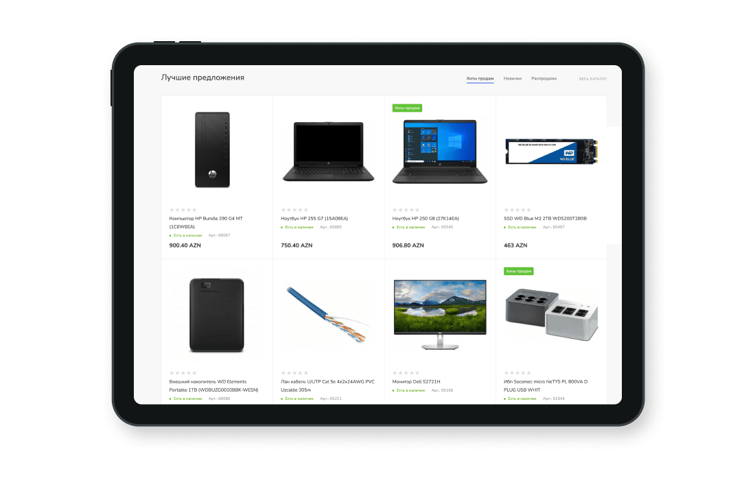 - возможность отображать подборки товаров с характеристиками на главной странице (новинки, акции, хиты продаж);