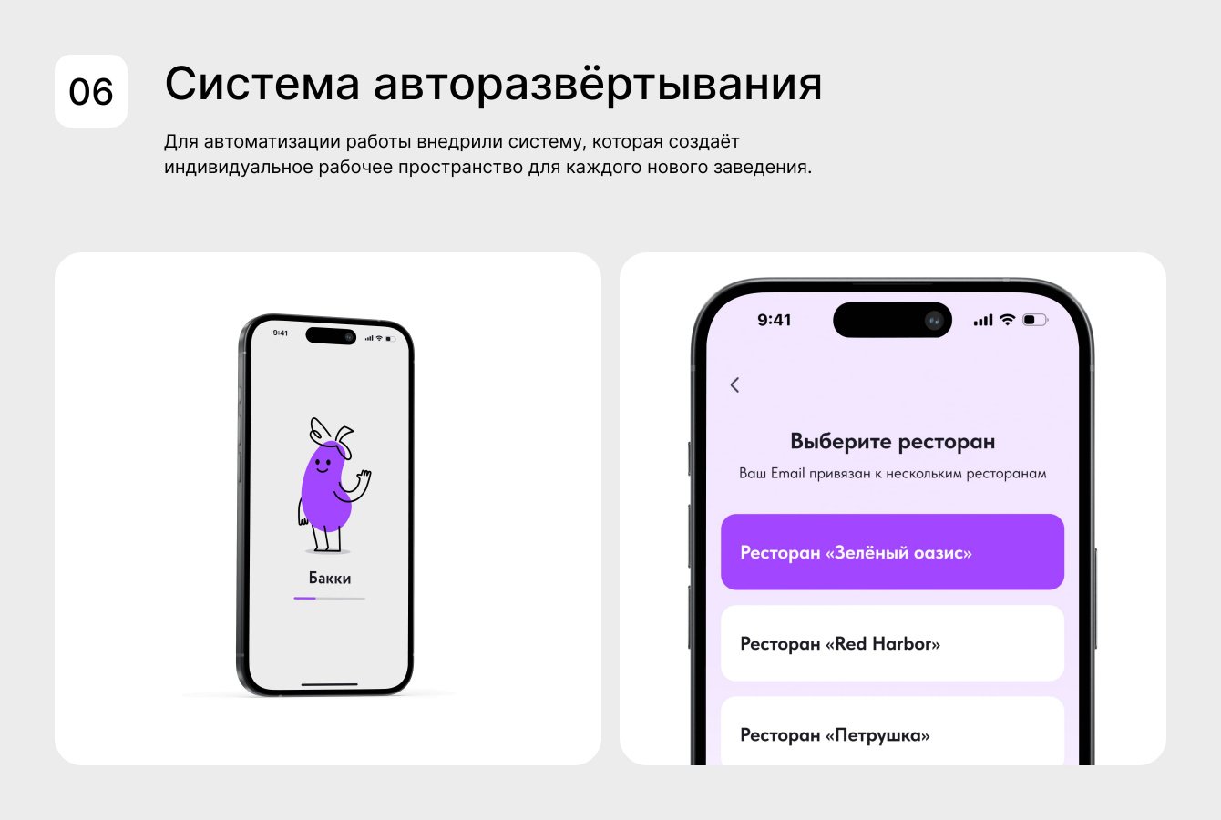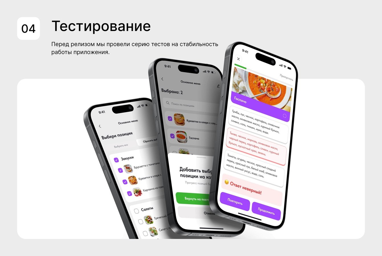 Главная сложность заключалась в объединении обучения и управления в одном приложении. Задумка была в том, что продукт SaaS-решение и подходит разным ресторанам.