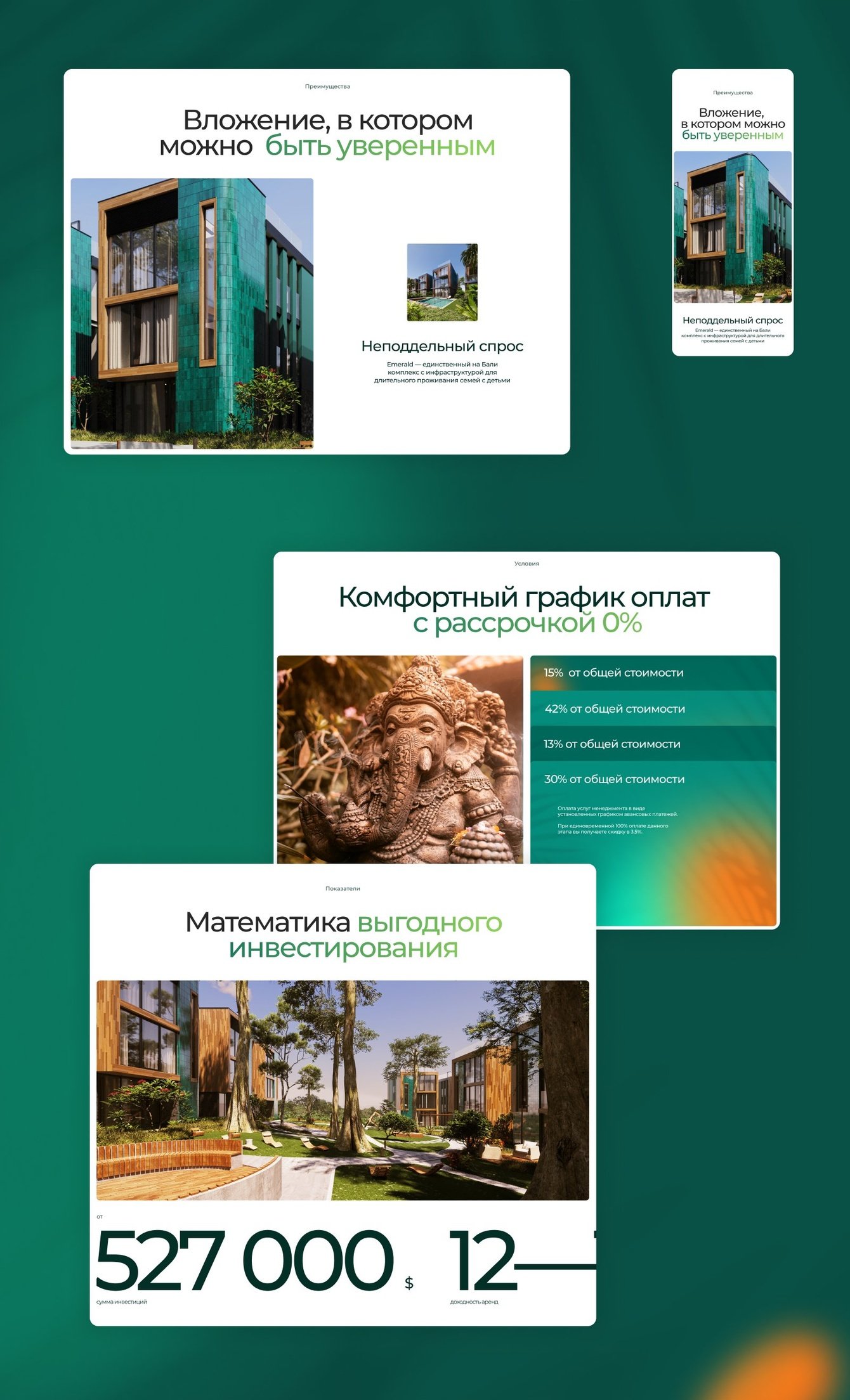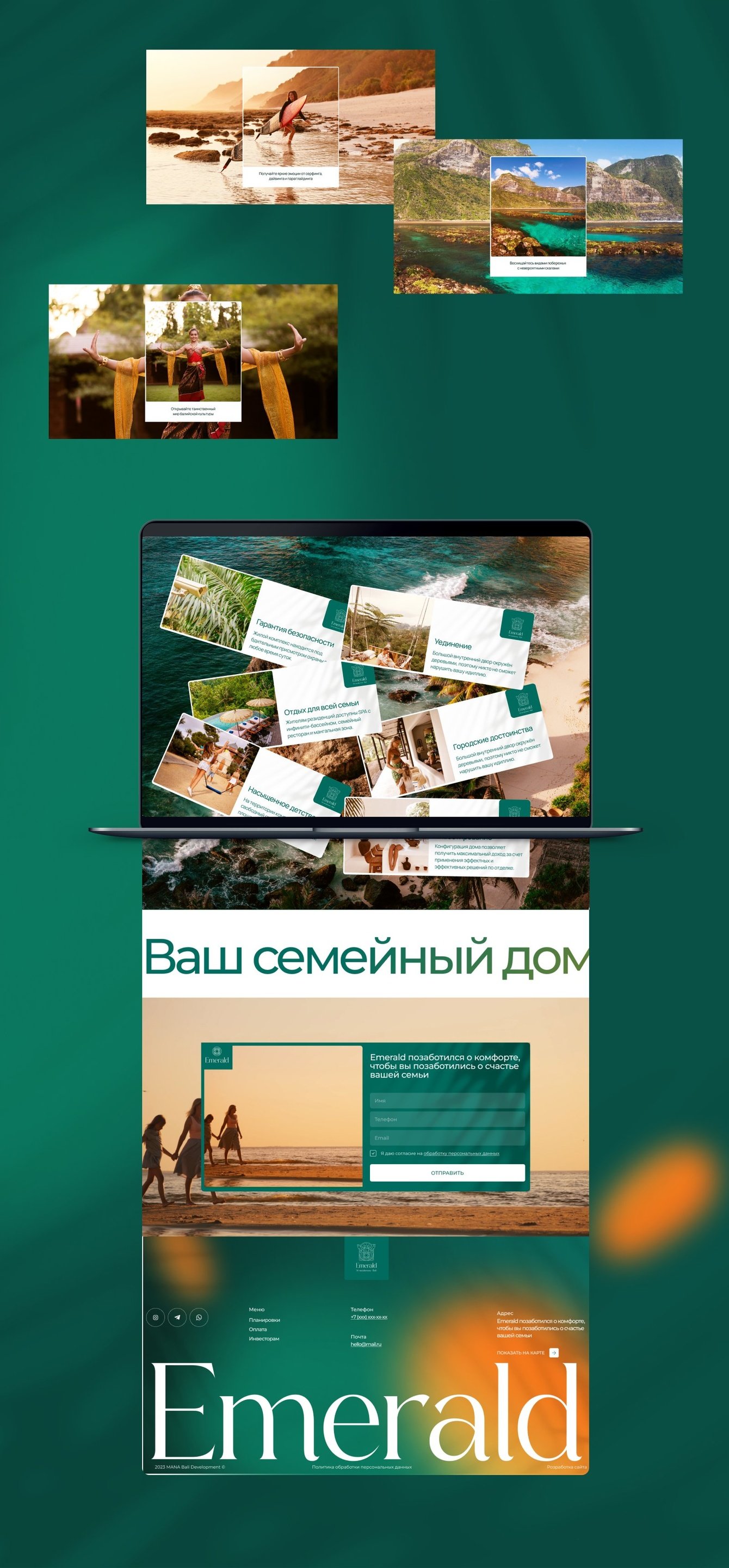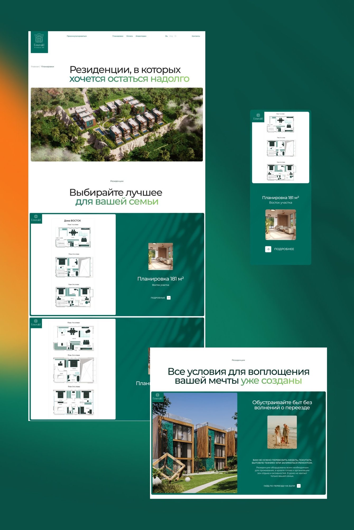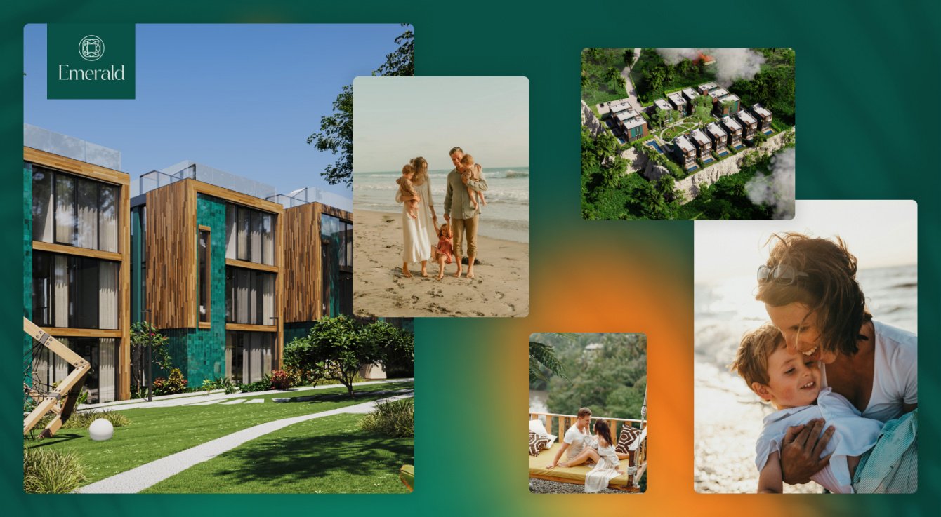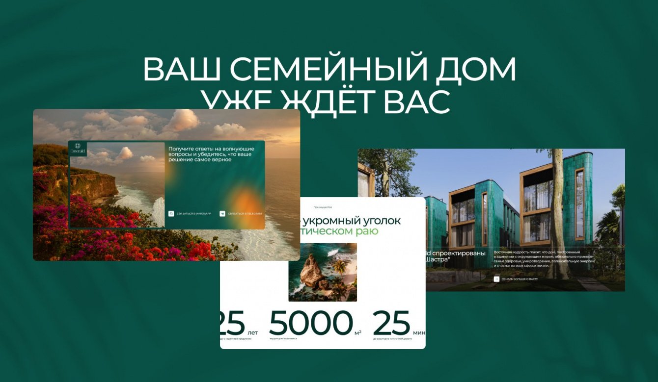 Чем лучше мы изучали тему, тем больше понимали, что жилой комплекс идеален для семейного проживания на Бали. Премиальность недвижимости мы решили отразить в дизайне, а в текстах и подаче сделать главный фокус на семье.