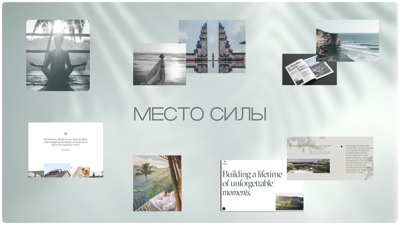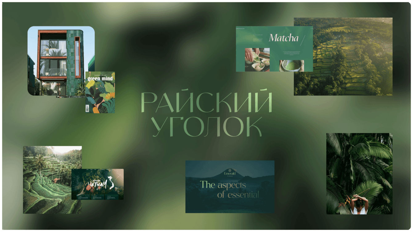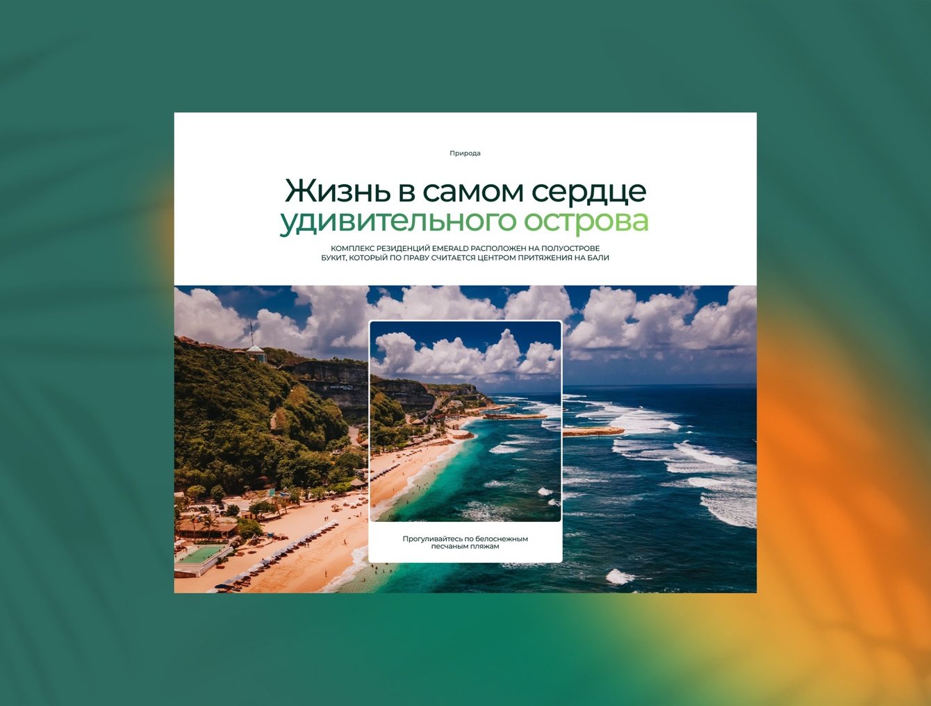 Райский уголок. В первую очередь притягиваем взгляд к удивительному месту, где расположены резиденции. Складываем тропическую мечту из завлекающих, наполненных чувством текстов, природных паттернов и текстур, яркой палитры и визуального колорита Бали.