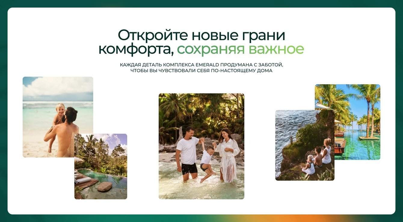 Просмотр фотографий из семейных альбомов у каждого из нас вызывает улыбку. На сайте мы хотели повторить эти впечатления при помощи фотографий, которые могут оказаться в альбомах будущих клиентов Emerald: необыкновенная природа, уютный дом, живые снимки родителей и детей.