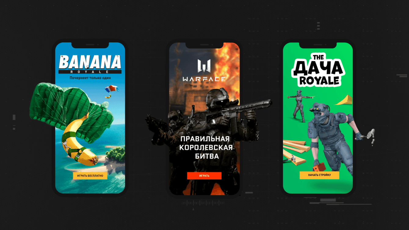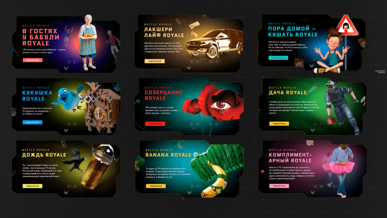 Мы придумали сотни вариантов самых причудливых Royal-ей на специальном лендинге, чтобы высмеять недостатки жанра и рассказать, что мы их исправили. Например, в Banana Royale ты один из 99 бананов на тропическом острове, и нужно почернеть последним.