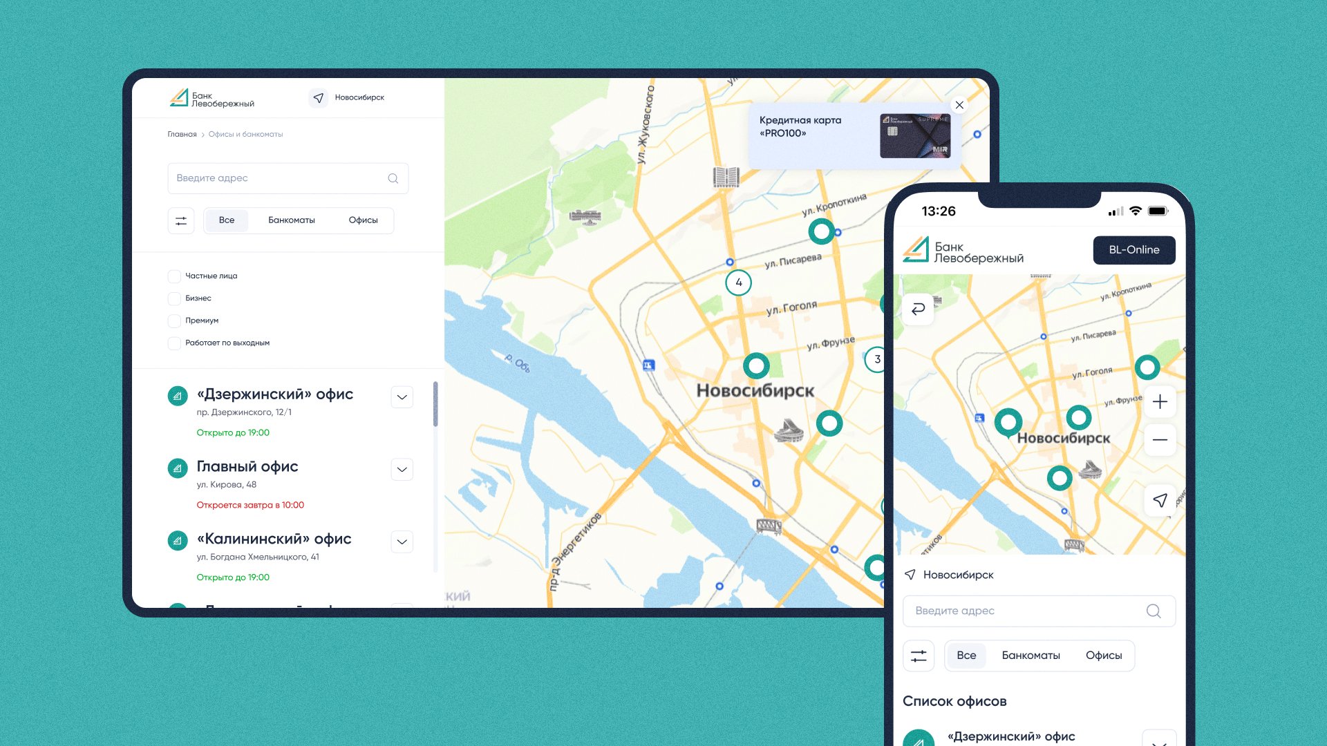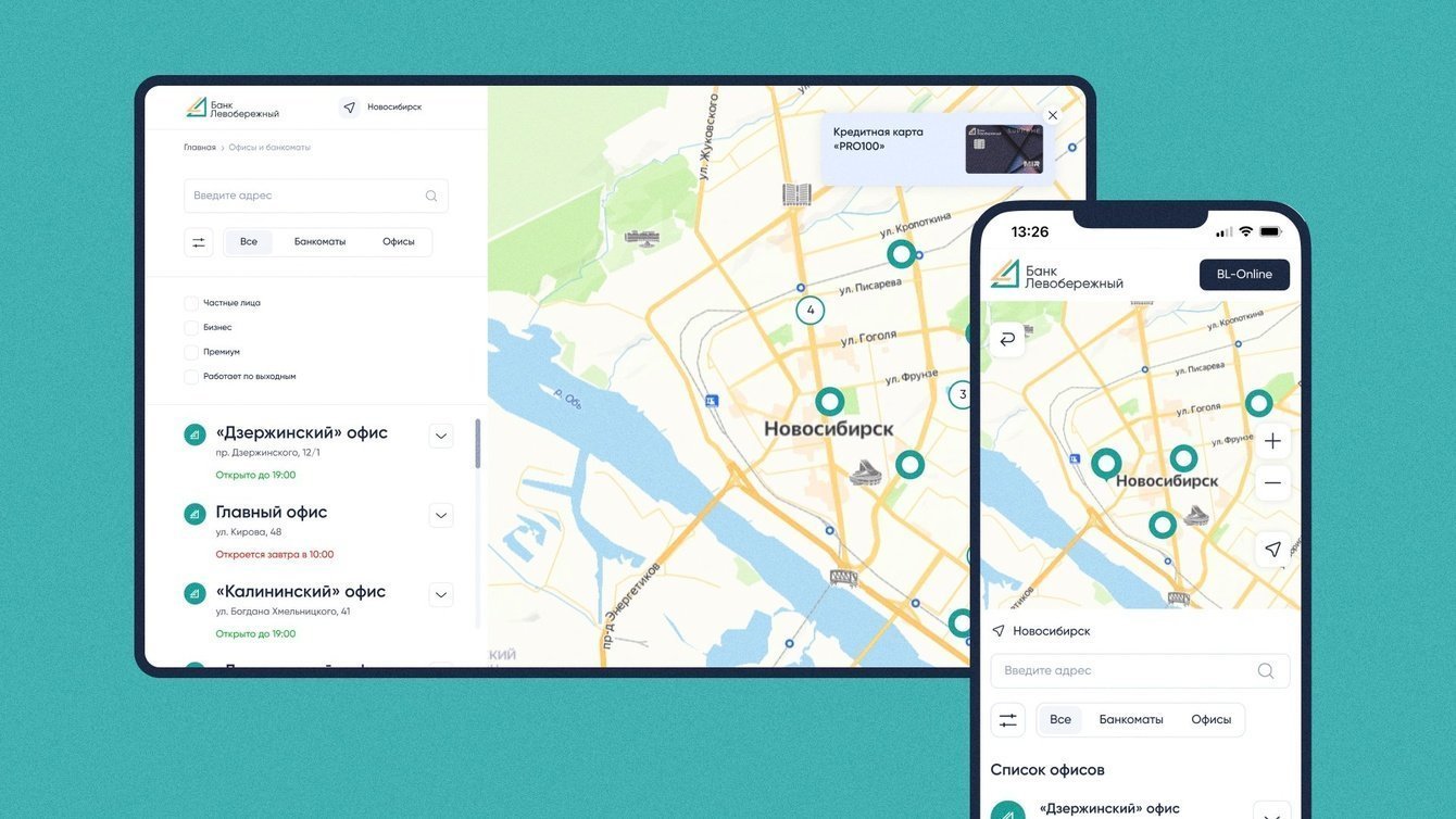 Разработали карту «Офисы и банкоматы» с выводом всех точек банка. Обеспечили возможность фильтрации точек в зависимости от клиентов, города, режима работы и т. д.
