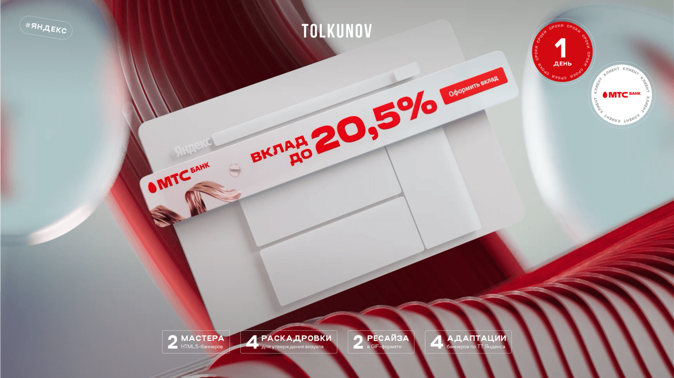 Мобильную версию баннеров подготавливаем в GIF-формате, расставляя нужный тайминг для каждого кадра. А в десктоп версии HTML5-баннера адаптируем код по требованиям Яндекса. Благодаря внутренним инструкциям и проверке — ошибки сведены к минимуму, поэтому модерацию баннеры проходят без проблем.