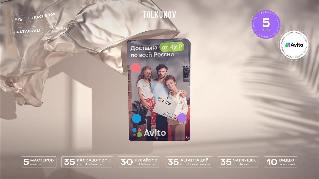 Разработать пять паков баннеров для рекламы Авито Доставки от 49 рублей и подготовить два формата видео для соцсетей