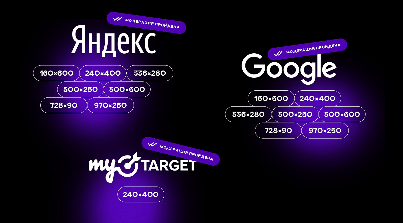 Параллельно велась работа над остальными раскадровками, по ним будут подготовлены ресайзы. К моменту, когда мастер-баннер был утвержден — у нас были готовы все материалы для быстрой работы над ресайзами. Все процессы работы заточены на то, чтобы наша часть работы занимала минимум времени клиента. Ну и не возникало проблем на этапе модерации.