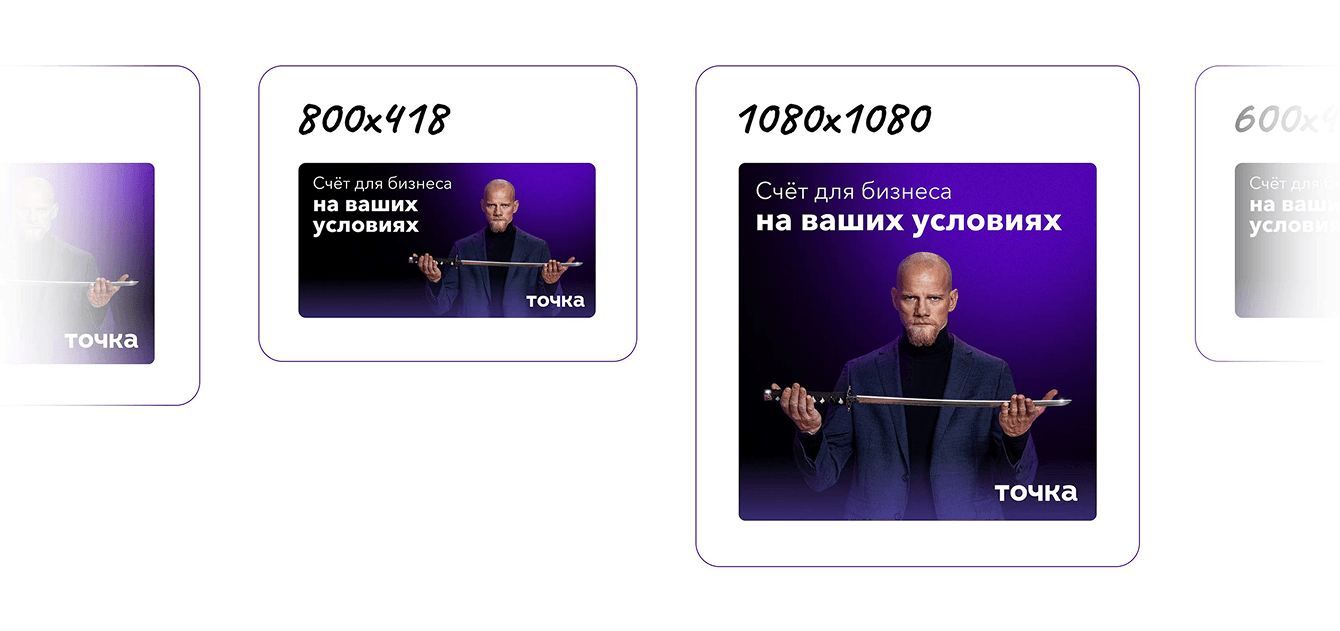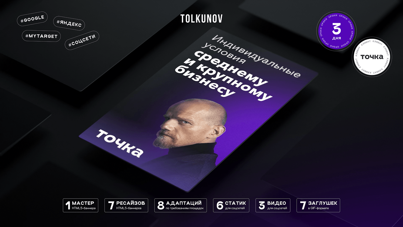 Подготовить баннеры для медийной рекламы и социальных сетей для банка Точка — нашего постоянного клиента. Рекламируем возможность выбирать лимиты в тарифе для среднего и крупного бизнеса.