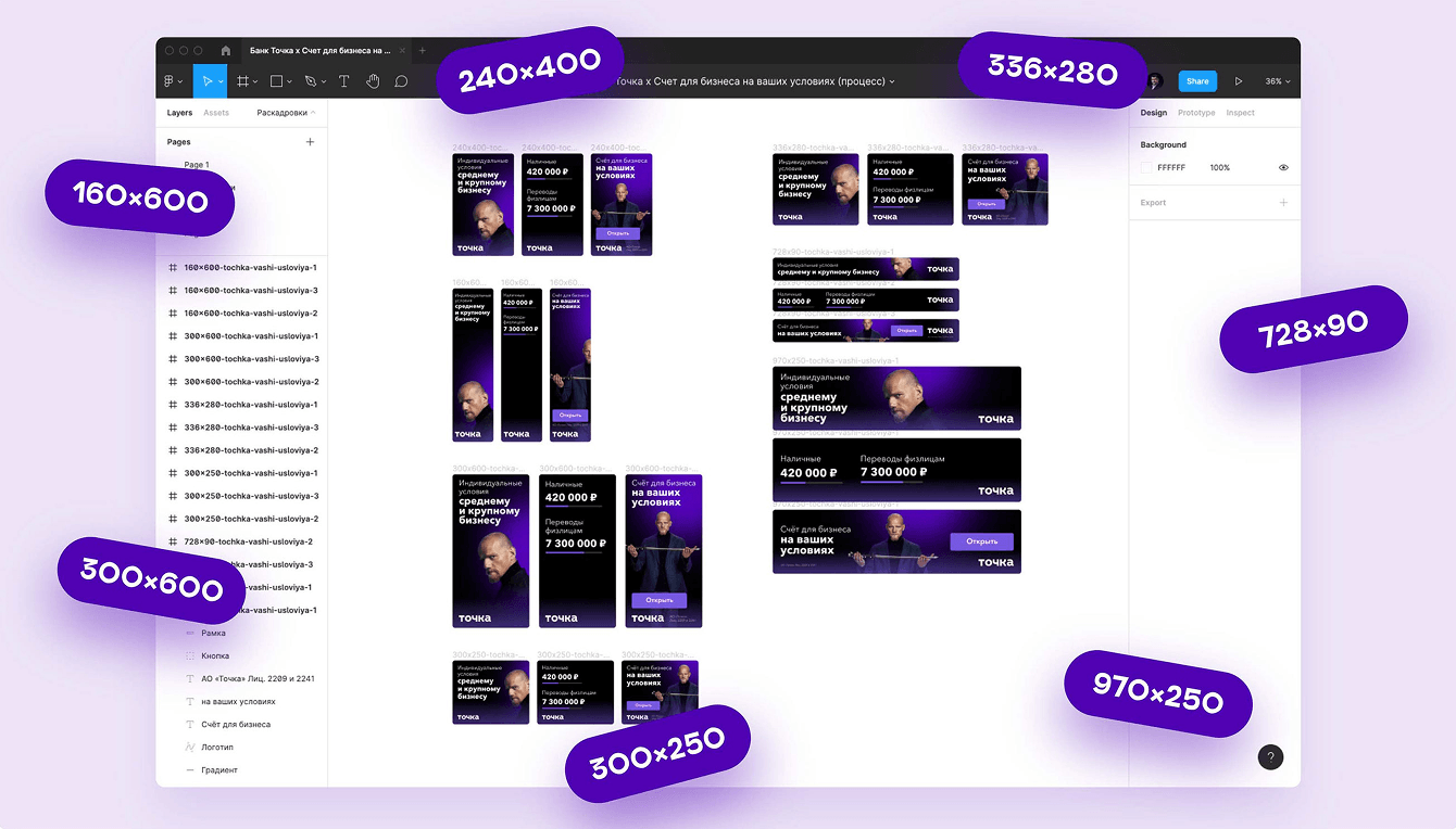 По медиаплану у нас 7 размеров HTML5-баннеров: 240x400, 160x600, 300x250, 300x600, 336x280, 728x90 и 970x250. Важно адаптировать всю придуманную анимацию без потери качества, а также не выйти за рамки технических требований.