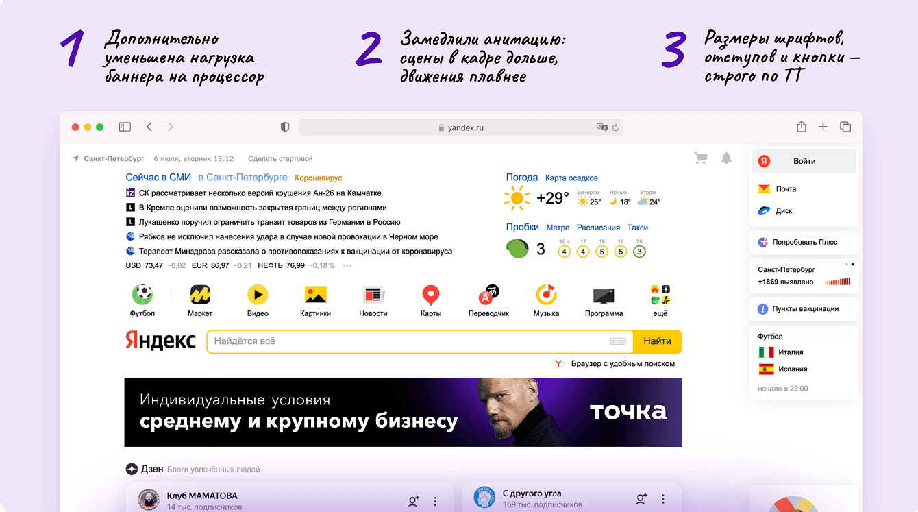 Корректируем анимацию специально под эти требования, три раза проверяем размеры всех элементов и отступов. Также готовим GIF-версию баннера для мобильных версии главной Яндекса.