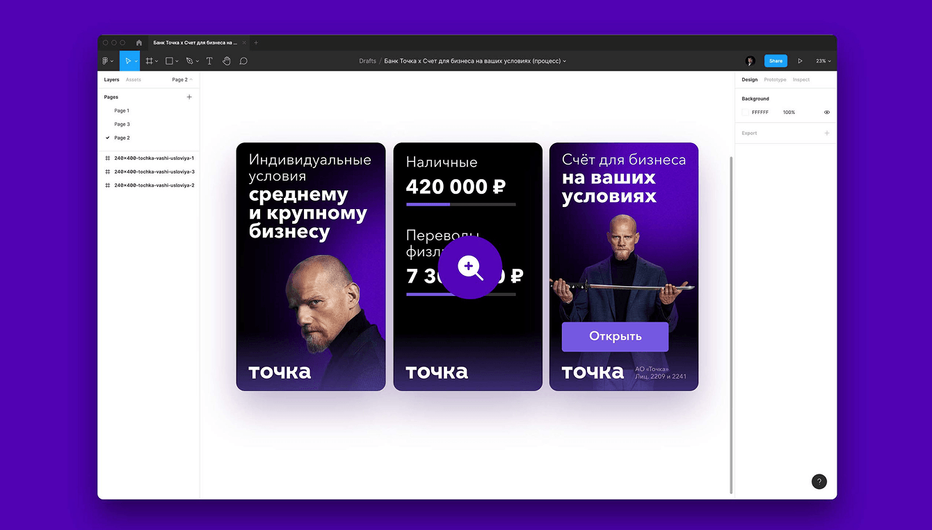 Шлифуем текст, подбираем и обрабатываем фотографии, выделяем главное, а затем стилизуем все элементы по гайдам банка. Получаем готовую в Фигме раскадровку.