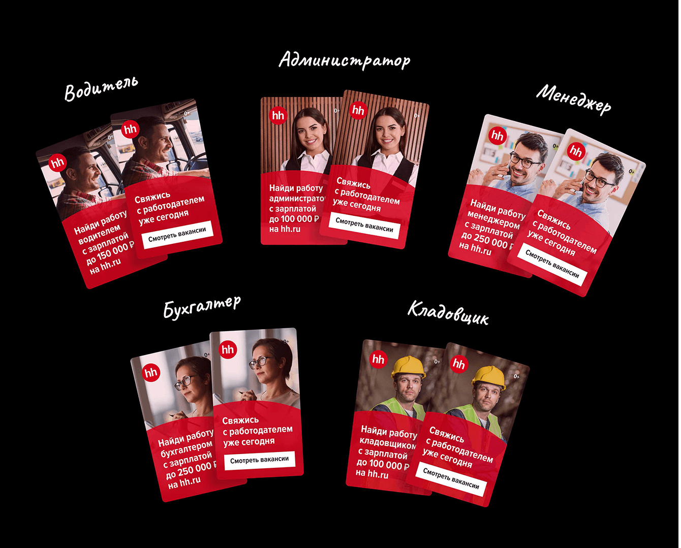 Подготовить баннеры для рекламы в Яндексе и Гугле под выдачу популярных запросов по поиску работы администратором, водителем, кладовщиком, бухгалтером и менеджером по продажам.