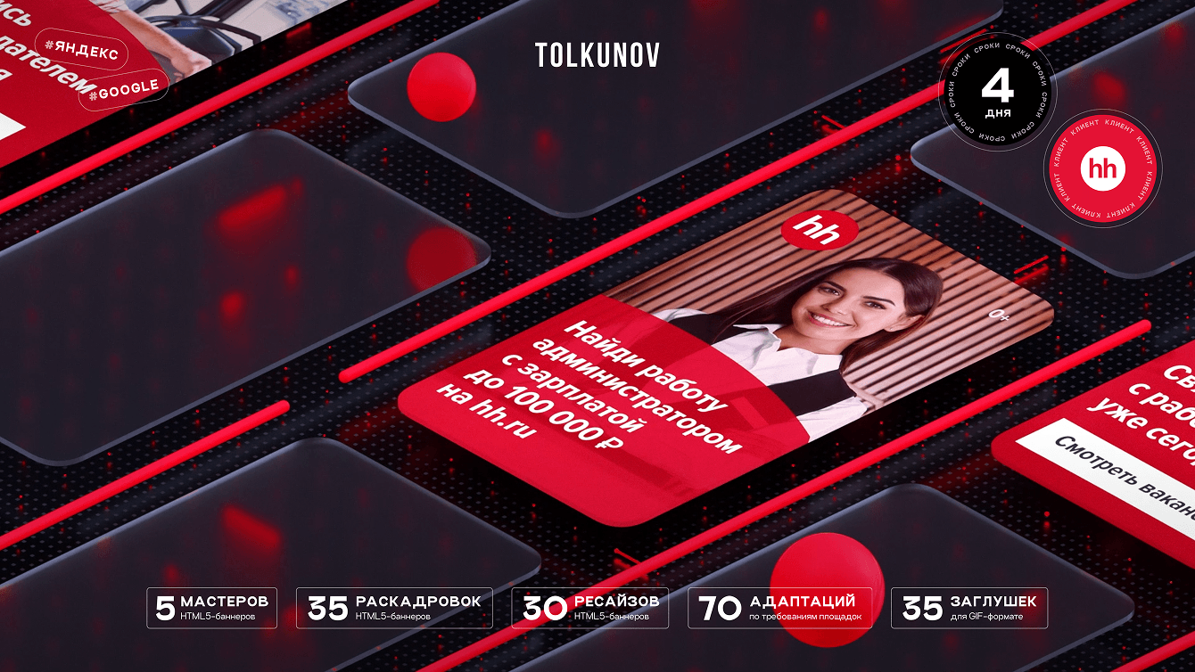 «От лица hh.ru сервиса по поиску работы сотрудников хочу выразить благодарность студии Толкинова. Ребята очень крутые, делают классно, быстро и качественно.