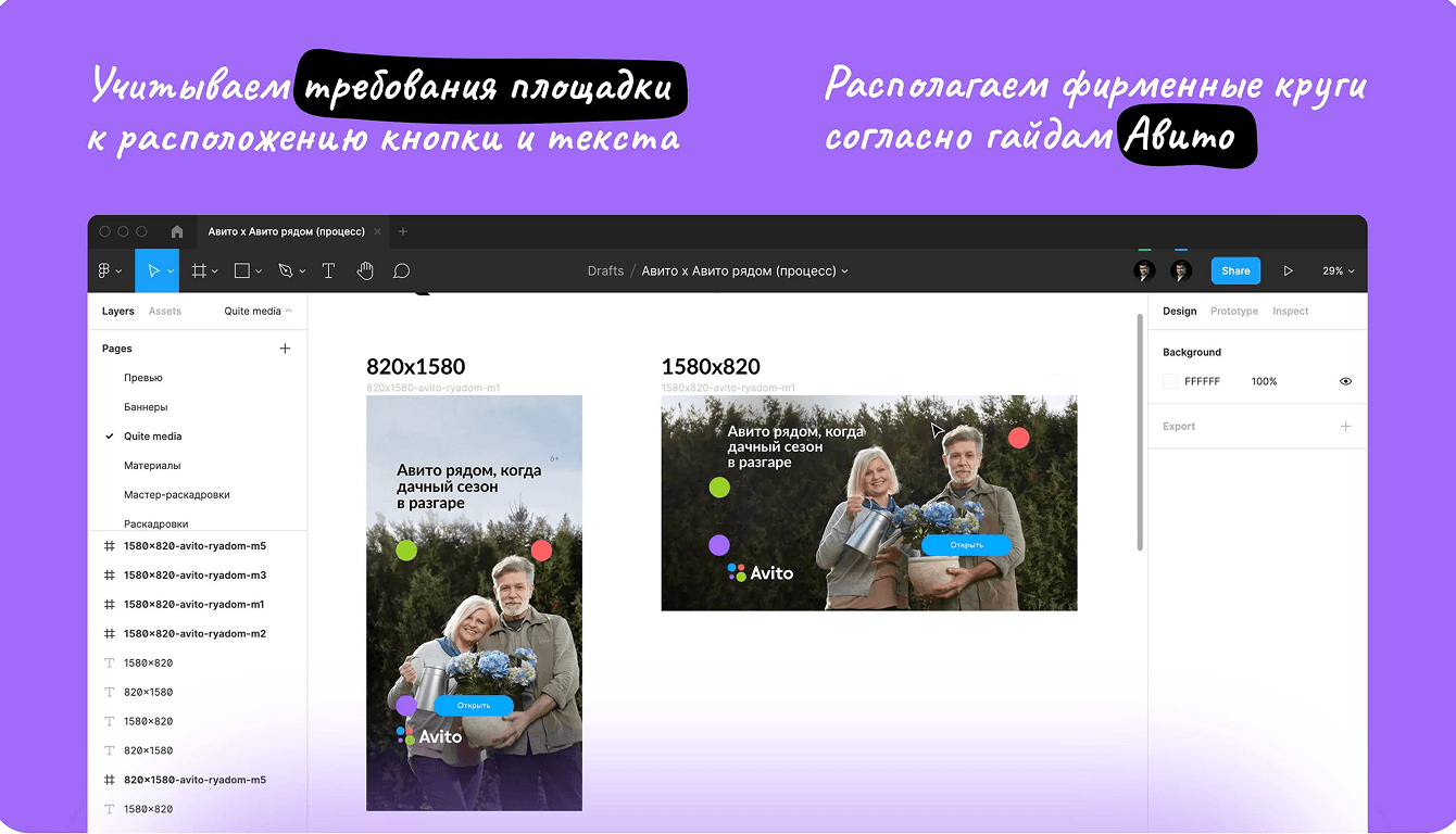 За основу берем первый кадр из раскадровок для HTML5-баннеров. Кроме классических размеров, есть два нестандартных: 820х1580 (вертикальный) и 1580х820 (горизонтальный). В них нужно учесть, что края баннеров будут скрываться в зависимости от устройства, поэтому выверяем расположение каждого элемента до пикселя. Фото, заголовок, фирменные круги и кнопка должны быть на своем месте и видны каждому пользователю.