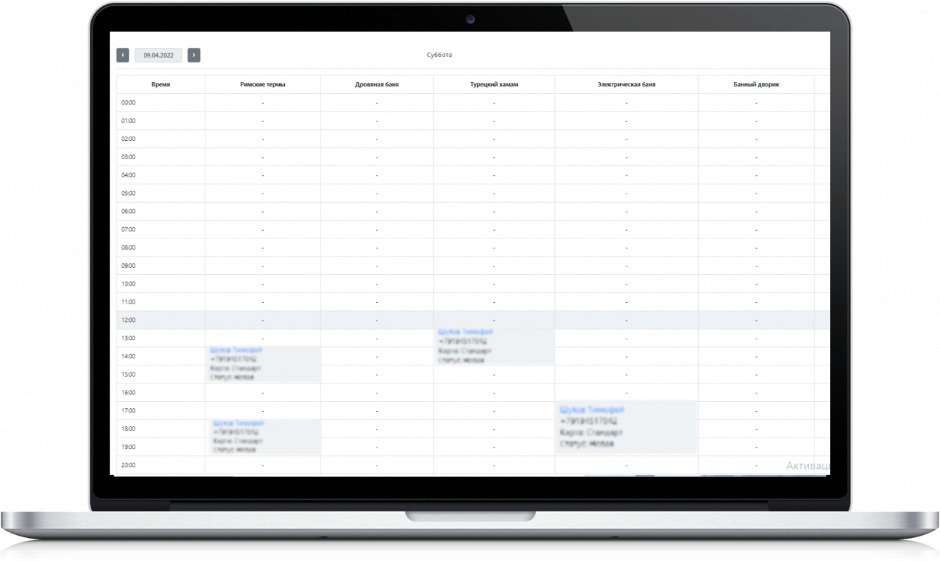 Перед нами стояла задача оцифровать все бизнес-процессы банного комплекса и перенести из 4х разрозненных систем в единую CRM-систему. Система должна была обеспечить прозрачность всех бизнес процессов, обеспечить наглядную "сетку записи" для бронирования услуг комплекса. Также система должна учитывать все продажи дополнительных товаров и услуг, содержать складской учет и правильно считать остатки