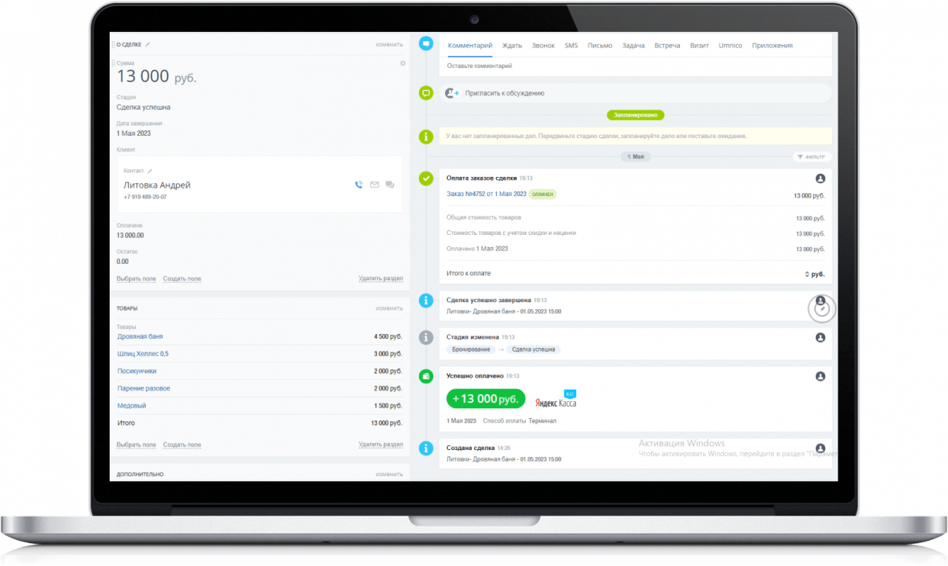 После полного погружения во все бизнес-процессы и тщательной аналитики, было принято решение в качестве CRM-системы остановить выбор на Битрикс24. Наша команда доработала коробочное решение для полного соответствия Системы бизнес-процессам заказчика и существенно сократило влияние человеческого фактора на работу организации. У администратора стало меньше ошибок, скорость обработки каждой заявки. Лиды с сайта и через телефонные звонки сразу же попадают в Систему, где администратор быстро обрабатывает входящий запрос и бронирует необходимую баню, время пребывания кдиента и все дополнительные услуги.