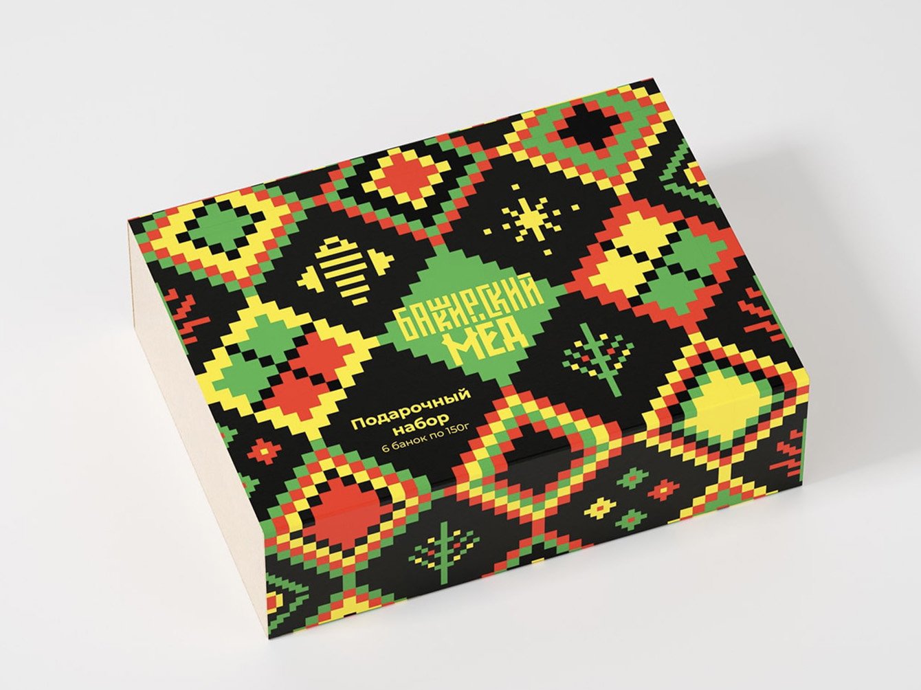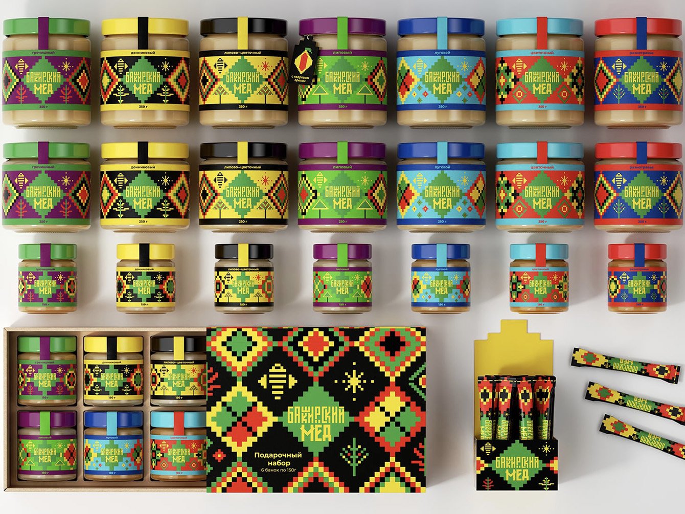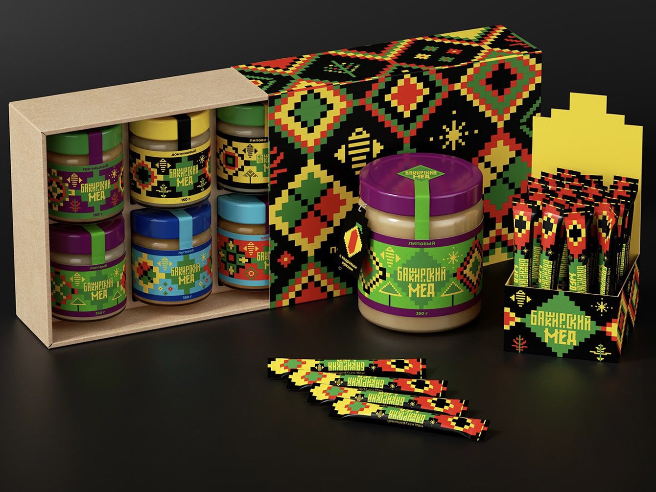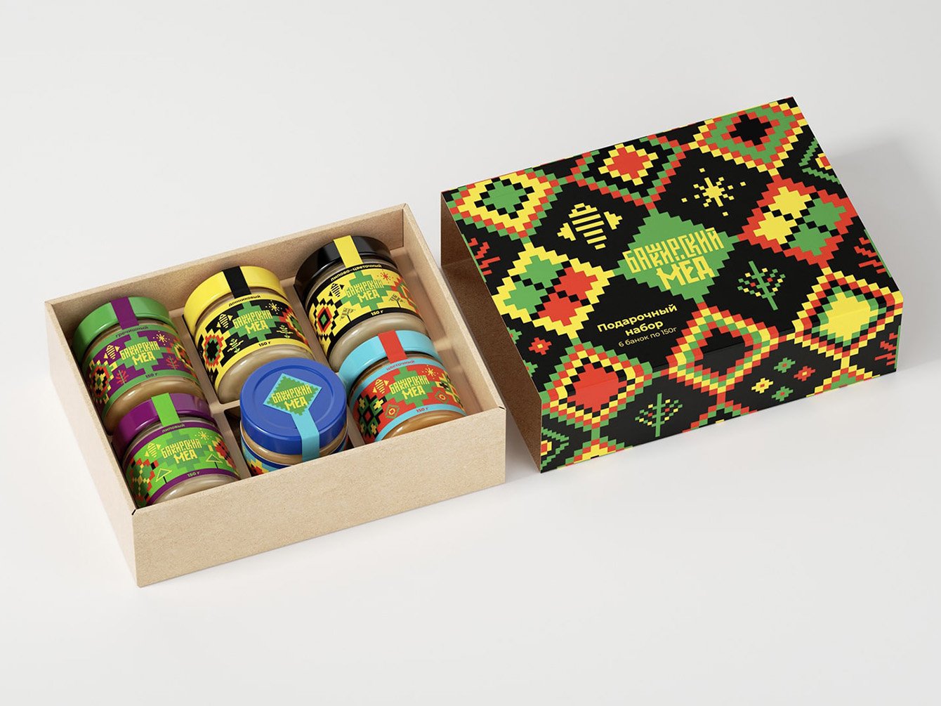 В упаковке обыгрывается традиционный башкирский орнамент, в который зашиты пиктограммы-дескрипторы вида мёда (липовый, цветочный и т.д.). Упаковка включает в себя несколько видов банок, подарочные коробки, стики.