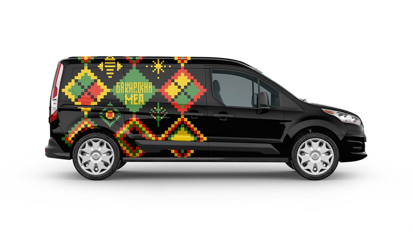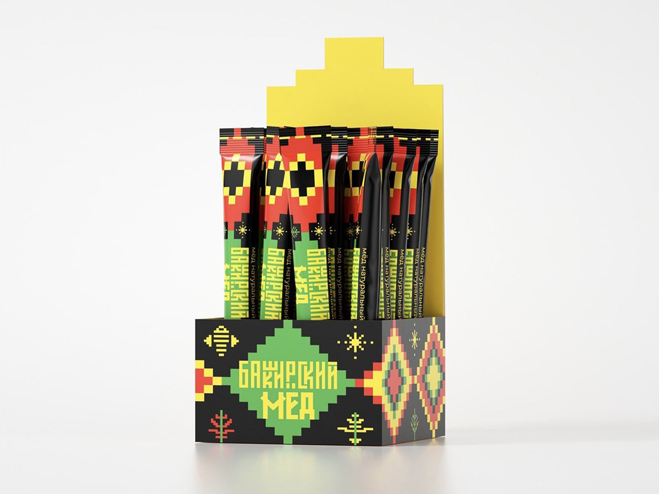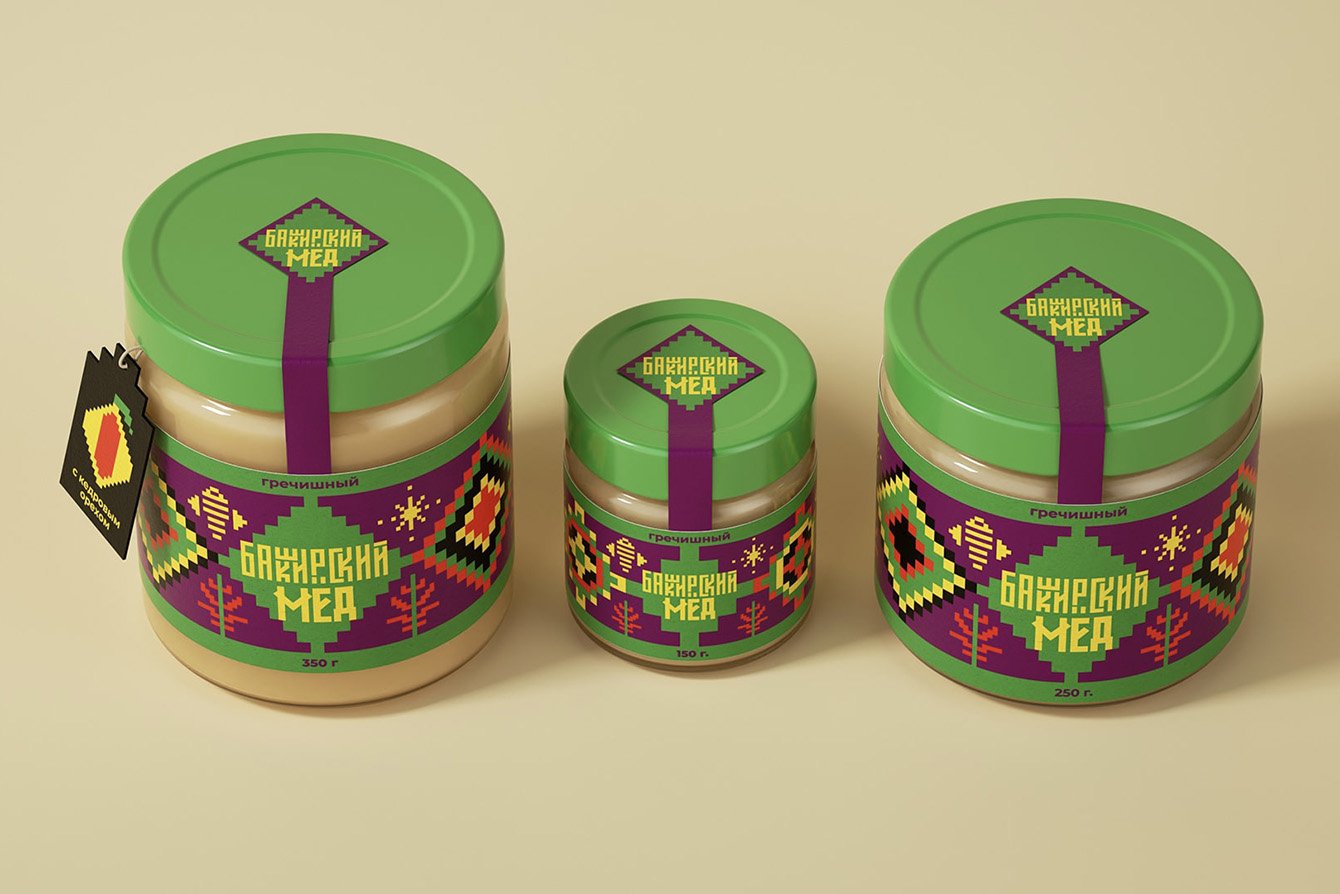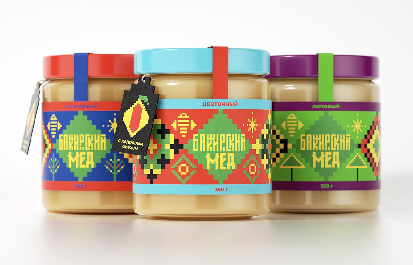 В упаковке обыгрывается традиционный башкирский орнамент, в который зашиты пиктограммы-дескрипторы вида мёда (липовый, цветочный и т.д.). Упаковка включает в себя несколько видов банок, подарочные коробки, стики.