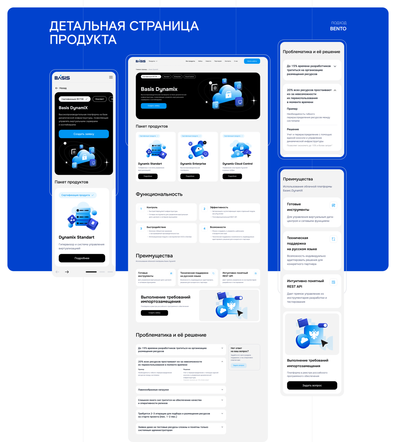 Подход Bento позволяет создавать удобные и функциональные сетки, которые легко масштабируются в соответствии с потребностями бизнеса. Это особенно важно для сайта, где разнообразные продукты и каждый из которых имеет свои особенности, что требует индивидуального подхода. Благодаря использованию сеток Bento мы можем достаточно быстро и гибко изменять внешний вид и функциональность страниц, адаптируясь под каждый отдельный продукт.