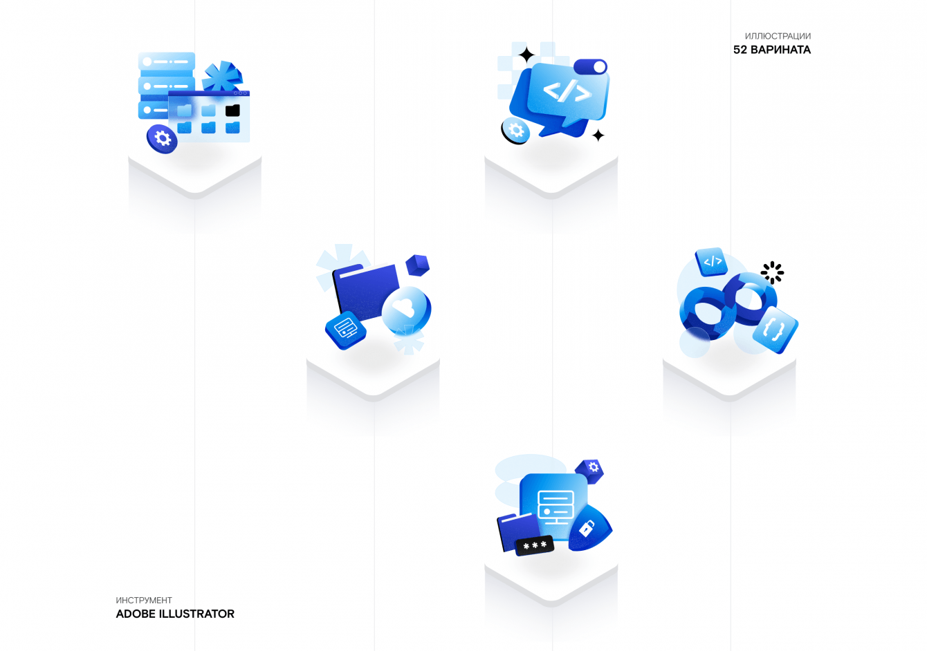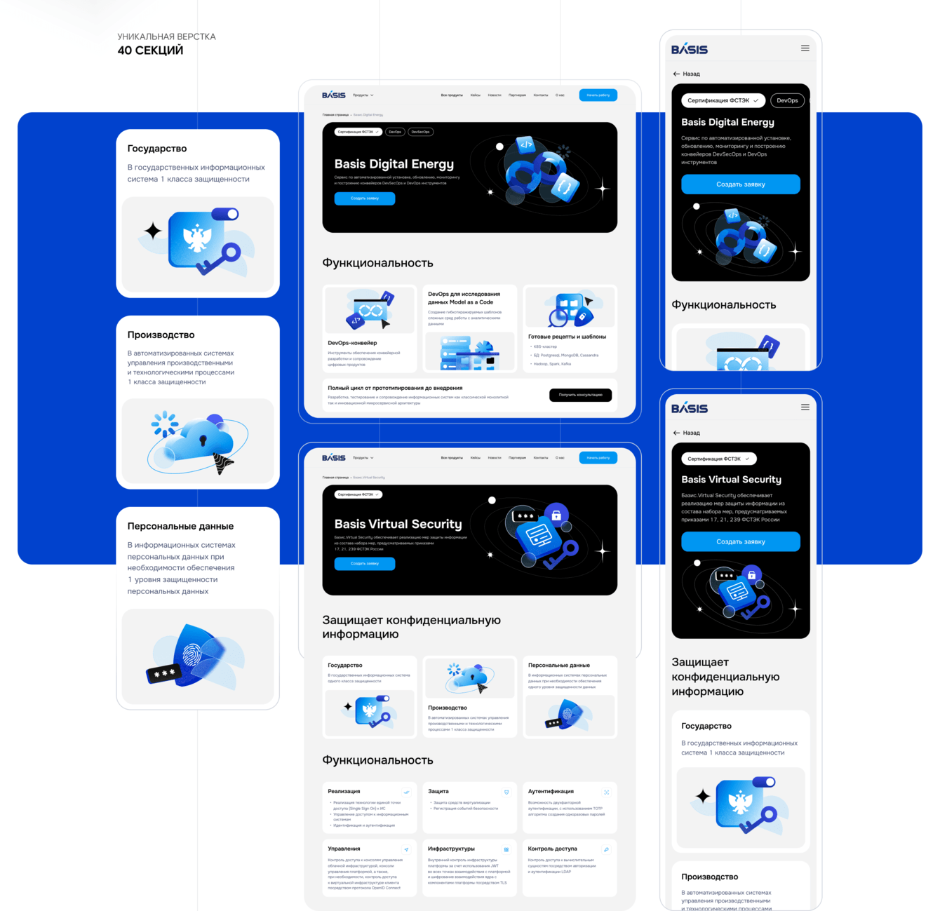Basis имеет 16 продуктов и для того, чтобы создать единую концепцию, мы применили единый подход для оформления всех разделов, но при этом учитывали стиль каждой отдельной страницы, поэтому использовали секционный подход под каждый продукт. В результате у нас получилось 40 уникальных секций.