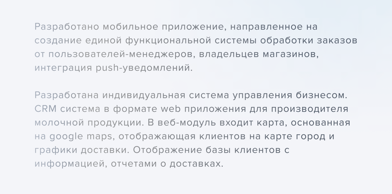 Команда разработала нам приложение и CRM-систему в срок. Коммуникация проходила через компетентного менеджера, не было недопониманий, работой довольны.