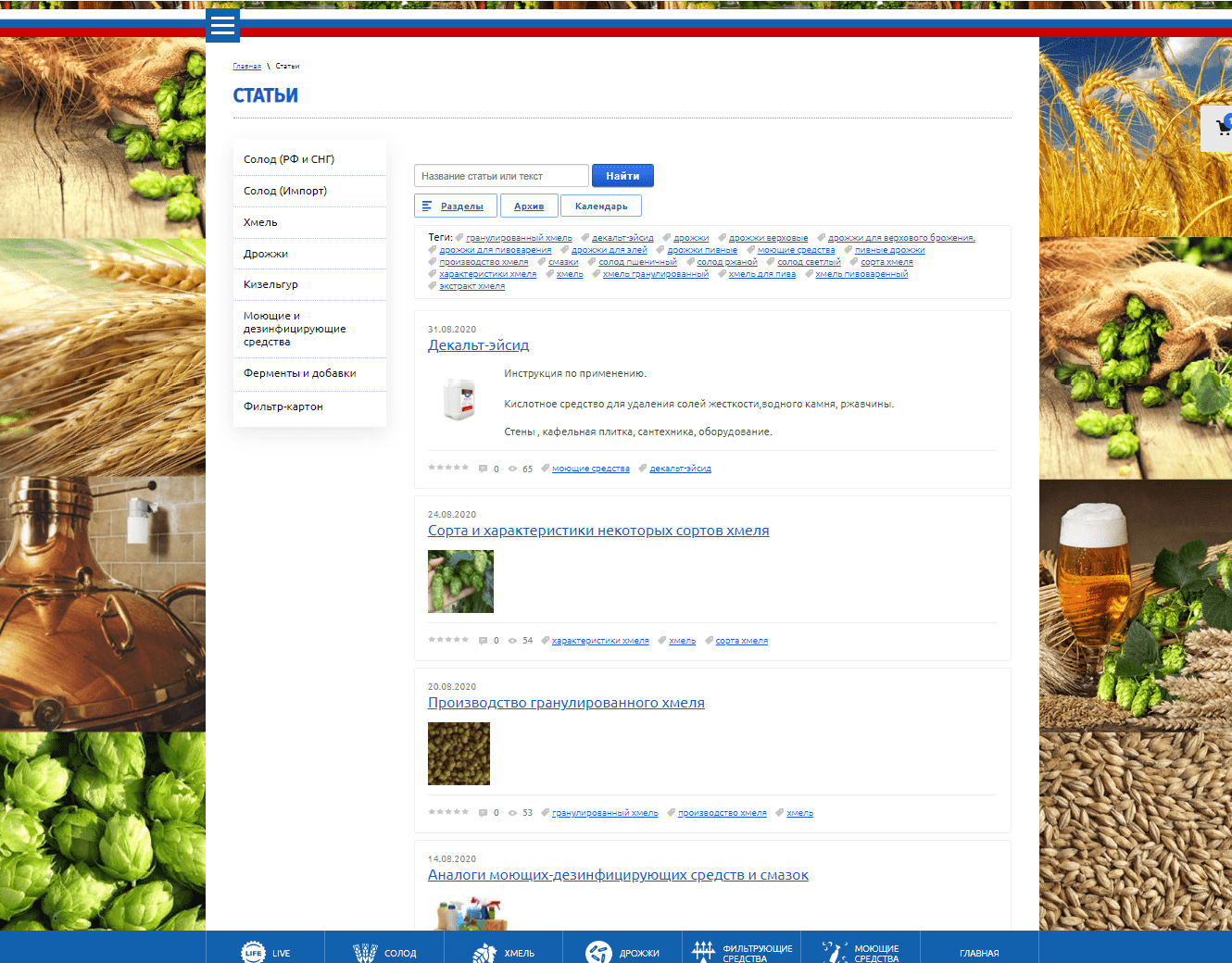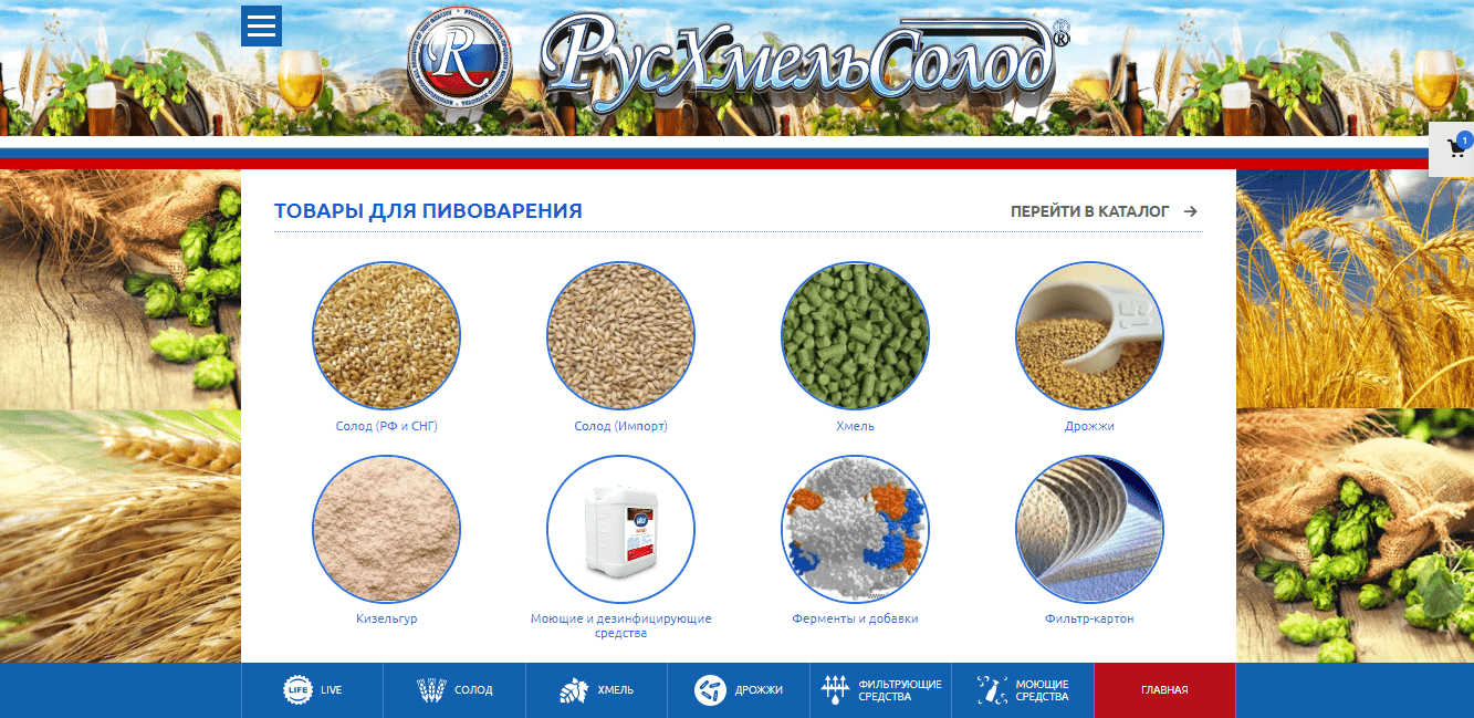 Компания продает товары для пивоварения оптом и в розницу. В ассортименте – солод, хмель, дрожжи, фильтры, различные моющие средства и прочие товары для пивоваренных заводов и единичных пивоваров. Имеются 7 филиалов предприятия в разных частях страны.