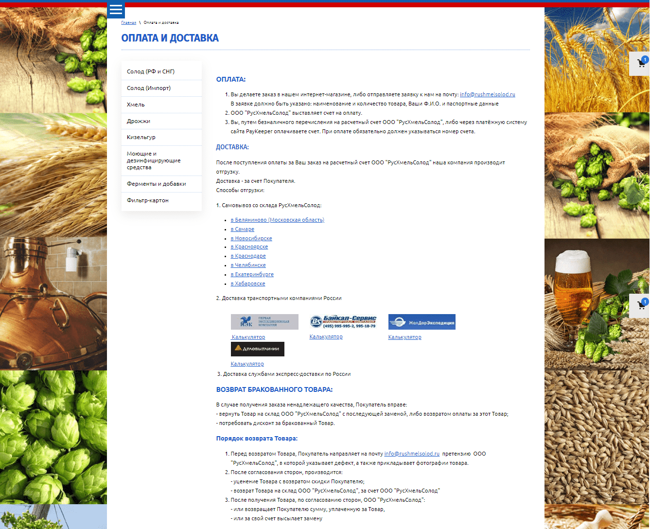У CMS.S3 отсутствует нестандартный функционал для интернет-магазинов. Можно добавить простой каталог с карточками товаров и настроить работу корзины. Однако на сайте Заказчика большего и не требовалось. Большая часть поставок «РусХмельСолод» производит оптом, а потому клиенты чаще звонят или напрямую приходят в оффлайн-филиалы.