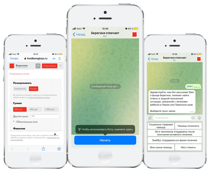 Была собрана вся информация о фонде, систематизирована и составлена карта чат-бота. Далее было разработано меню по тематикам и в каждом разделе собраны ответы на релевантные вопросы. Также наше решение было интегрировано с CRM-системой Битрикс24, что позволило быстрее отвечать на не стандартные вопросы, оказывать консультационную помощь тем, кто в ней нуждается. Помимо этого один из разделов меню предоставляет возможность предложить свою помощь фонду "Берегиня"