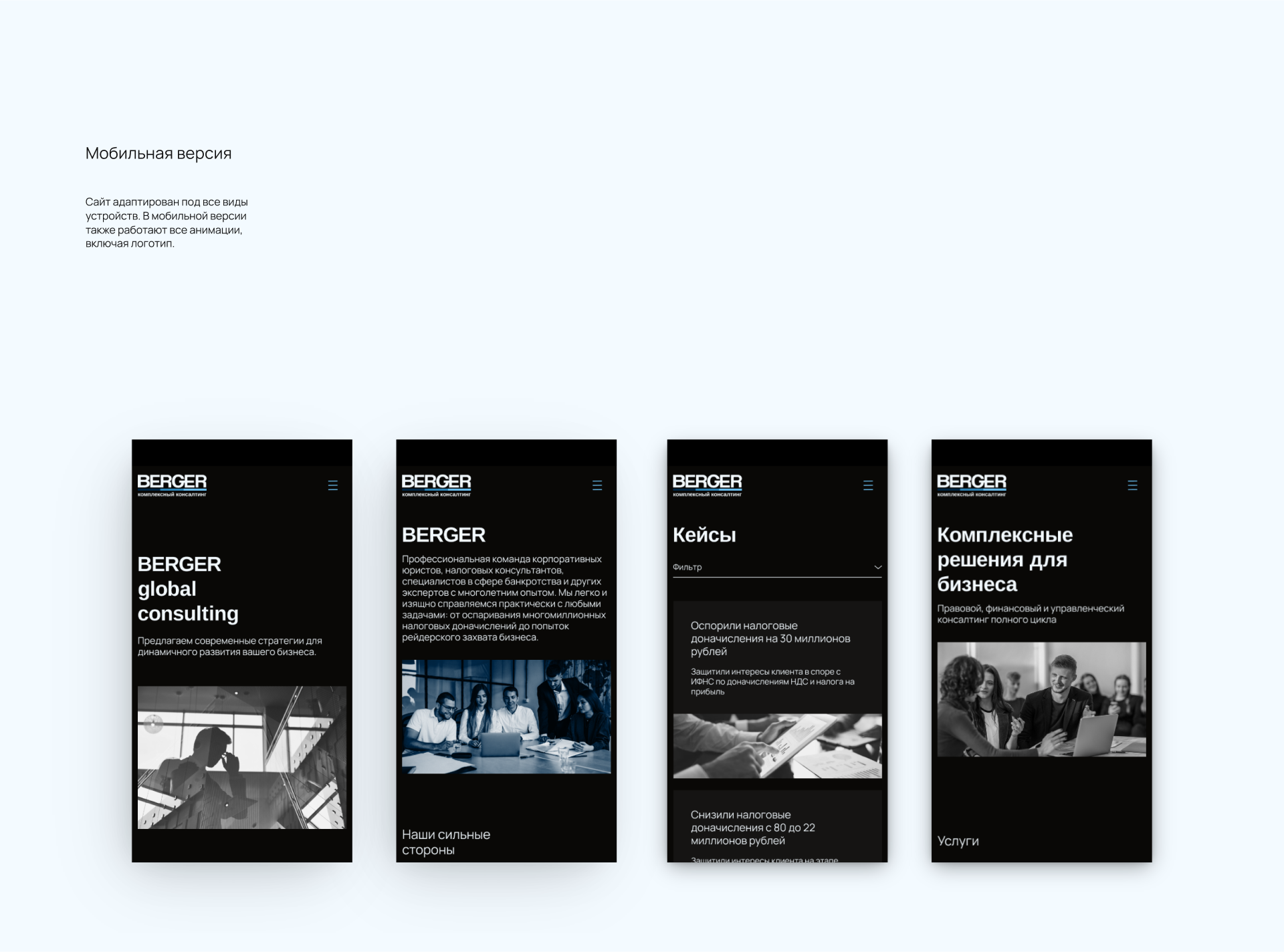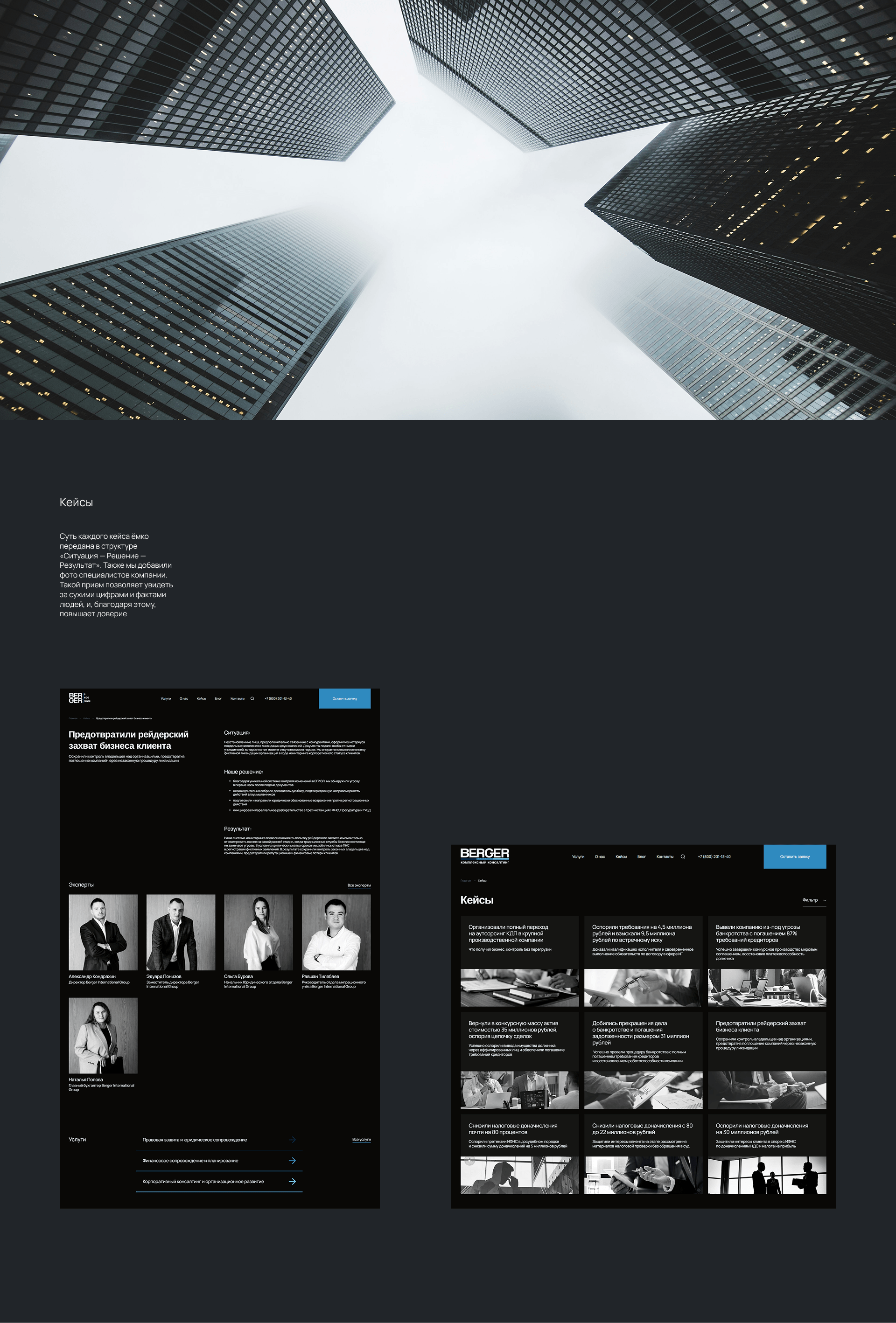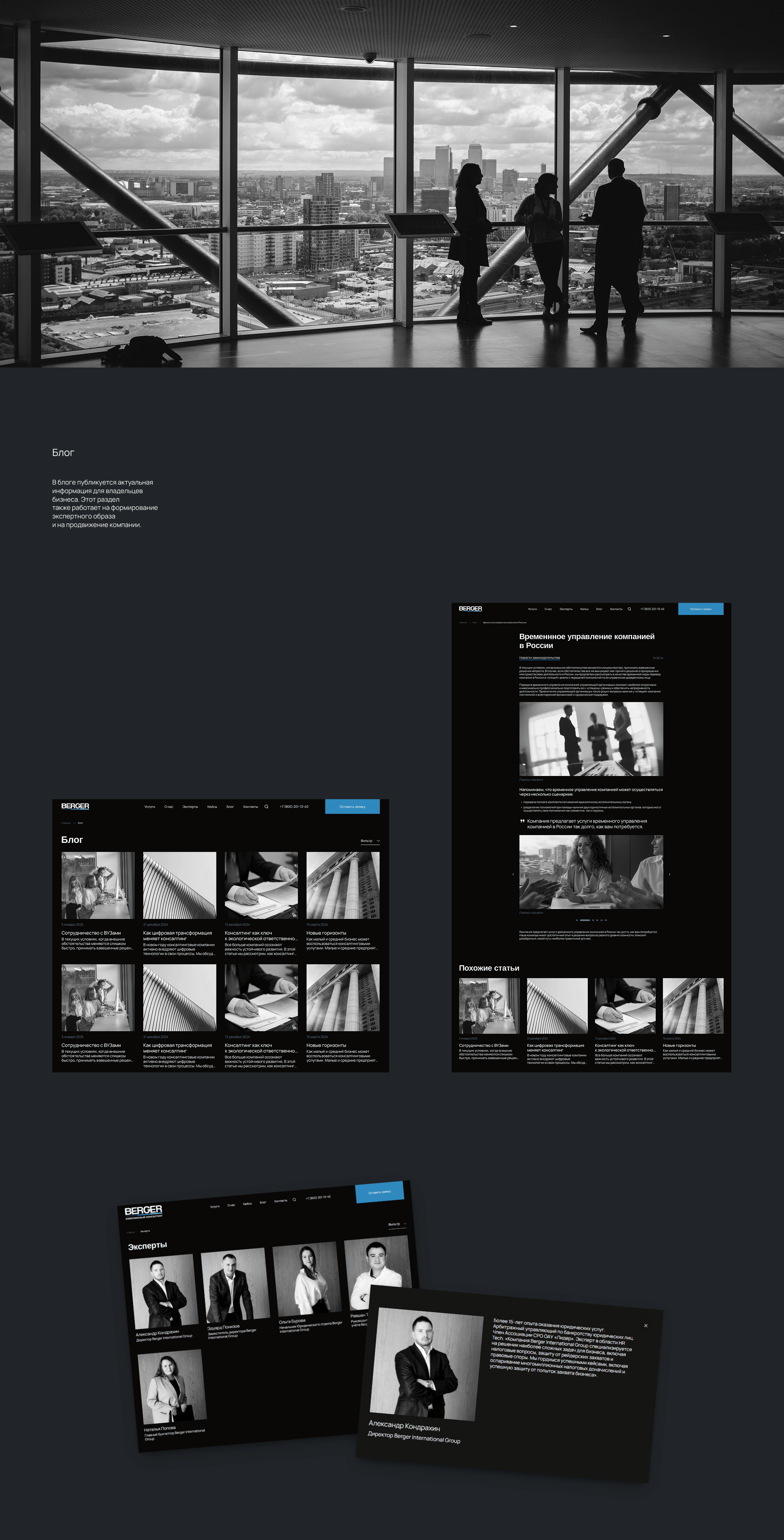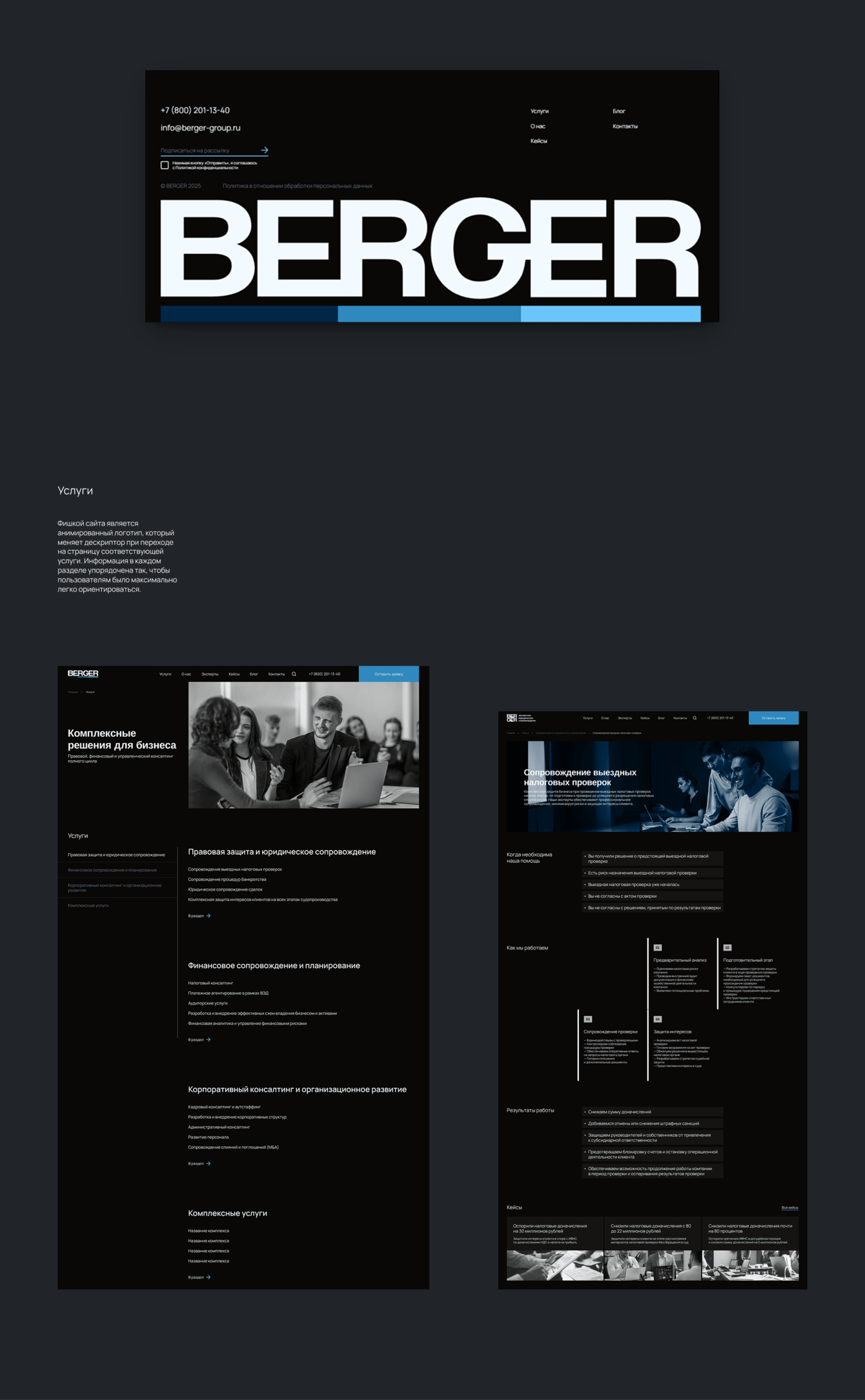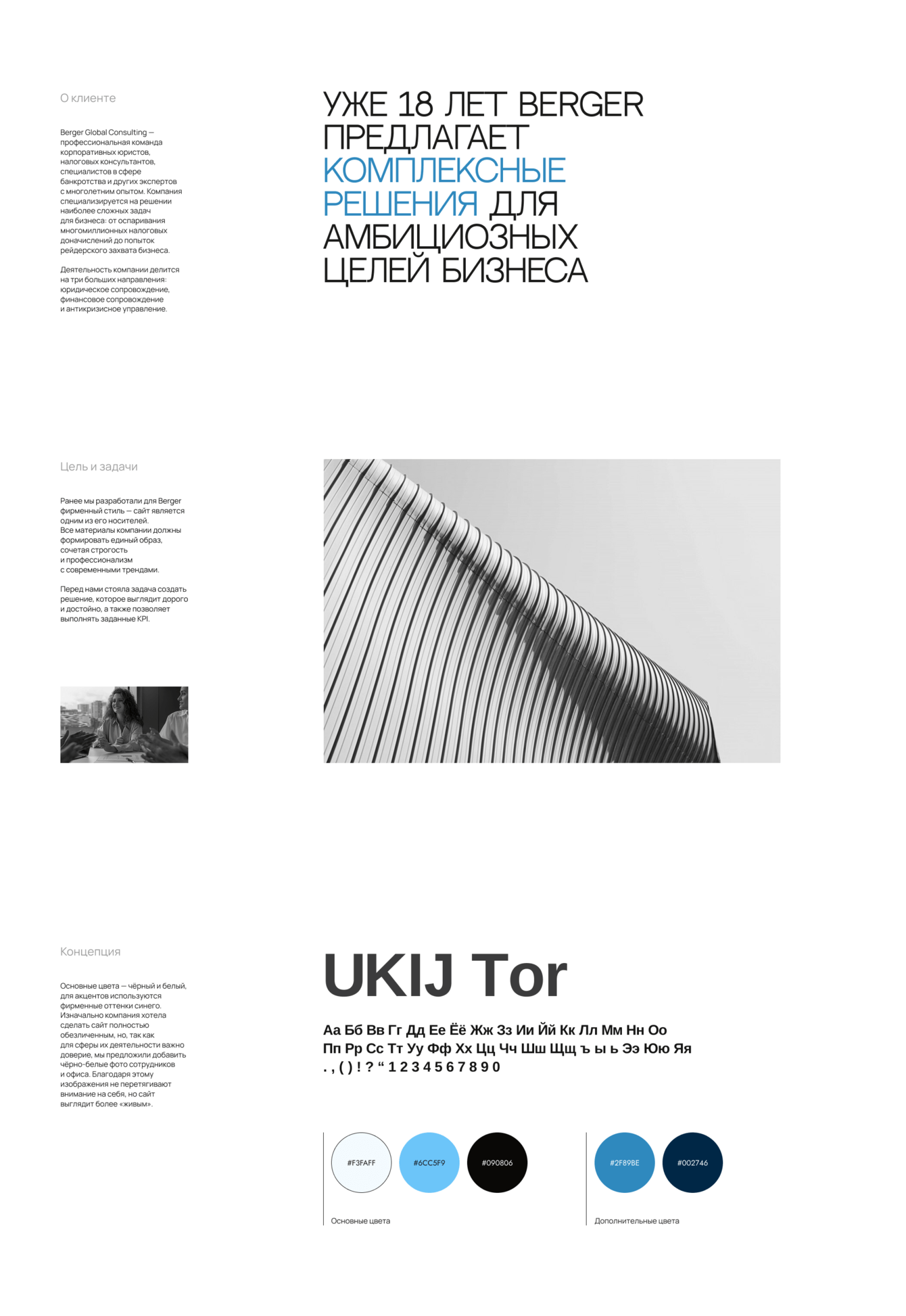 Ранее мы разработали для Berger фирменный стиль — сайт является одним из его носителей. Все материалы компании должны формировать единый образ, сочетая строгость и профессионализм с современными трендами.