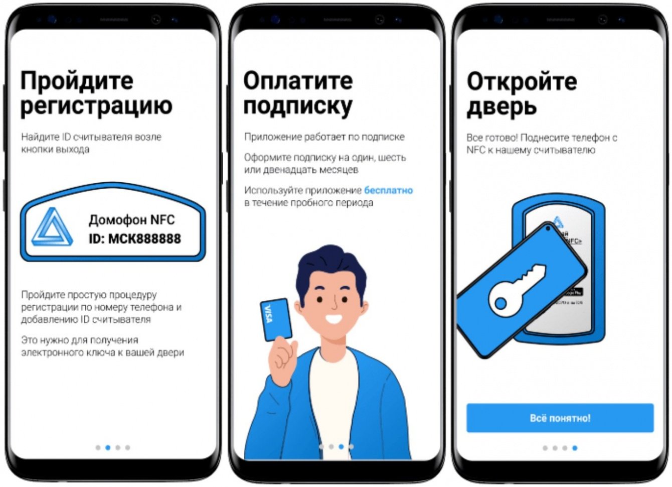 Мобильное приложение для получения доступа в помещения, оборудованные домофоном. Используя бесконтактную технологию NFC или Bluetooth, приложение передает код доступа считывателю, тем самым предоставляя доступ.