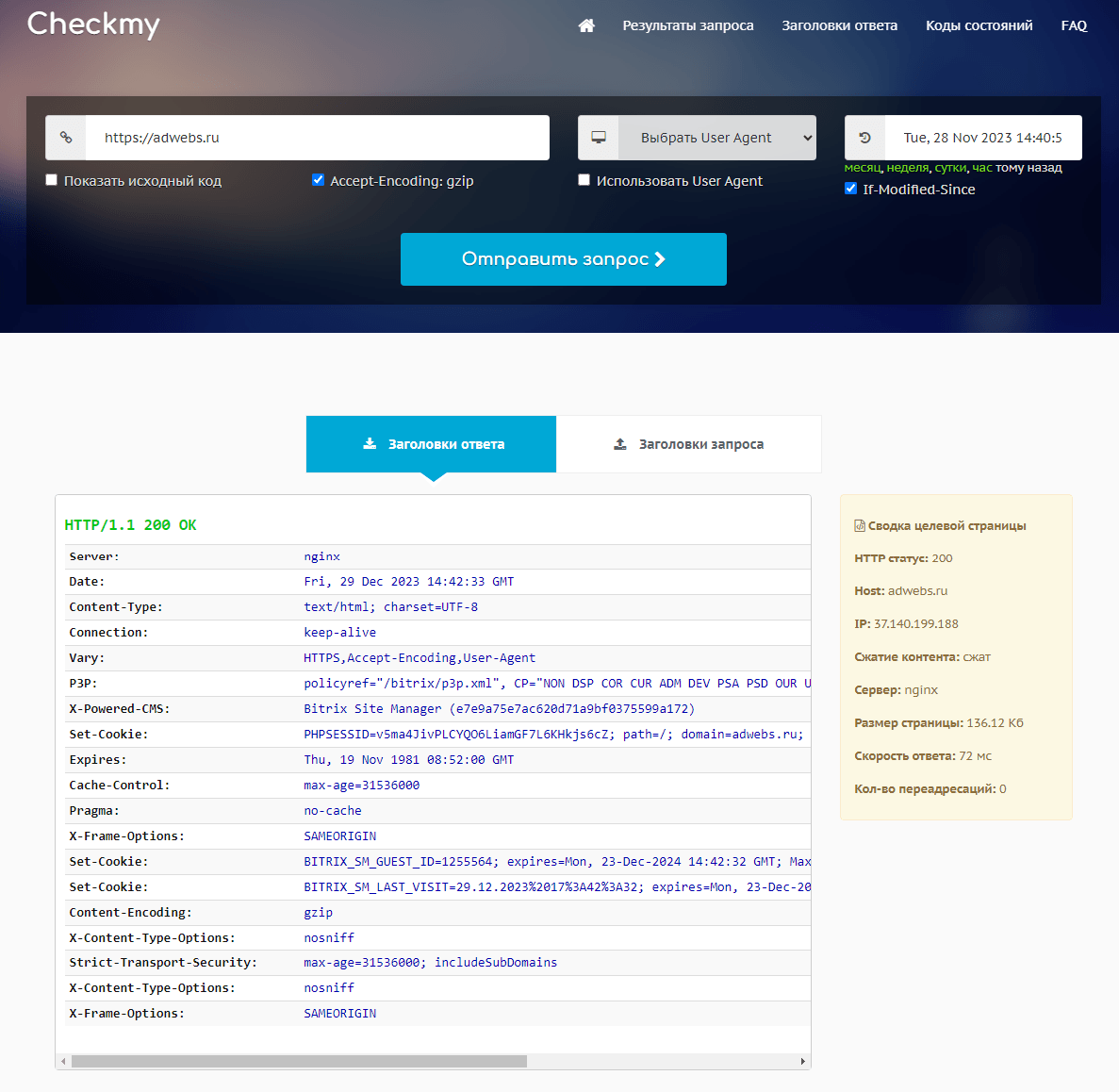 C помощью онлайн сервиса проверки кода ответа сервера вы можете проверить http заголовки, которые выдает сервер при запросе url адреса. Это может быть полезно для того, чтобы узнать включено ли сжатие контента на сервере, проверить исходный код страницы, узнать включена ли поддержка кеширования на сервере и получить другую полезную информацию из заголовков ответа сервера.