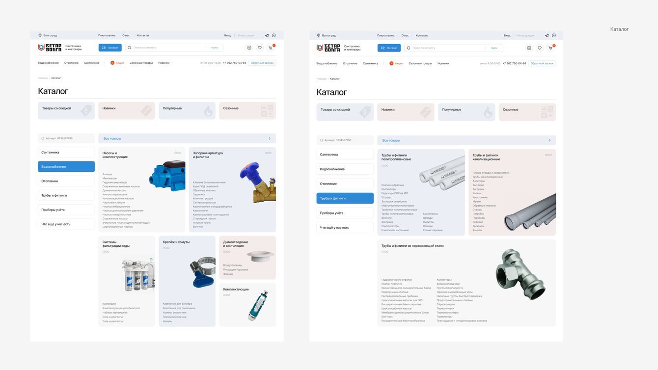 Чтобы сделать удобным поиск товаров, мы представляли себе путь пользователя. Товары делятся на 5 больших категорий, каждая из которых делится на подкатегории. Для каждой категории соответственно сделали отдельную страницу-каталог.