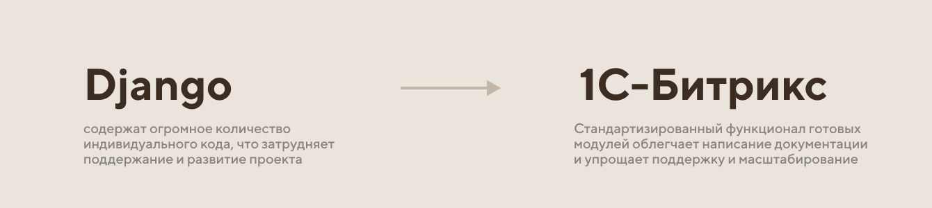 Решения на Python (и конкретно Django) редко применяются в сфере e-commerce в настоящее время в силу специфики - такие проекты содержат огромное количество индивидуального кода, что затрудняет поддержание и развитие проекта, и на практике делает почти невозможной безболезненную смену команд разработки. Для нового стэка мы выбрали CMS 1С-Битрикс: Управление сайтом. Обладая рядом недостатков, она имеет ключевое для большинства бизнесов преимущество - она содержит стандартизированный массив функционала “из коробки”, что позволяет запускать проекты с рядом готовых функций, а в дальнейшем, при желании и умении, поэтапно оптимизировать стандартные модули. Стандартизированный функционал готовых модулей облегчает написание документации и смену специалистов на проекте, а также упрощает поддержку и масштабирование.