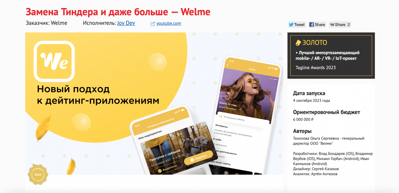 В 2023 году Welme был удостоен золота в премии Tagline Awards в номинации Лучший импортозамещающий mobile - / AR- / VR- / IoT-проект