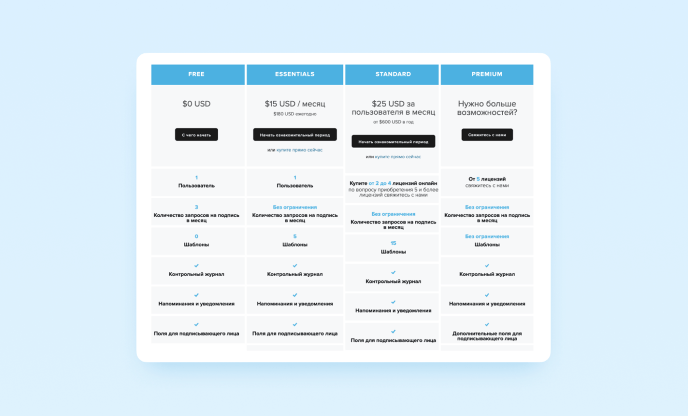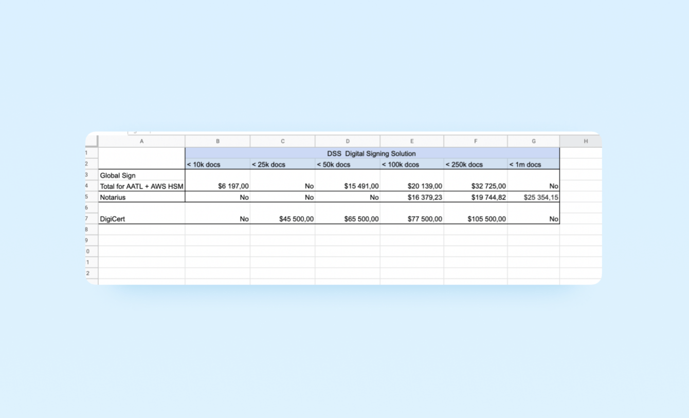 Начали с анализа конкурентов, смотрели, чем они пользуются для легализации подписей. Присмотрелись к четырем сервисам: