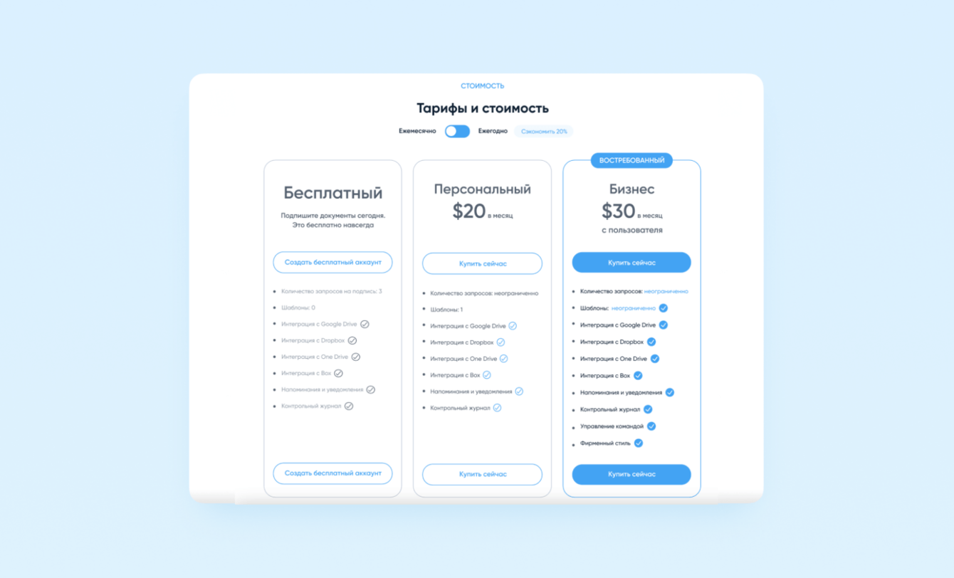 В качестве основного референса мы ориентировались на HelloSign. Основной отстройкой от конкурента стала стоимость — заказчик был готов давать доступ к сервису по цене ниже, чем HelloSign. В остальном наш сервис очень похож: легален более чем в 60 странах, также можно сохранять подписи и получать уведомления.