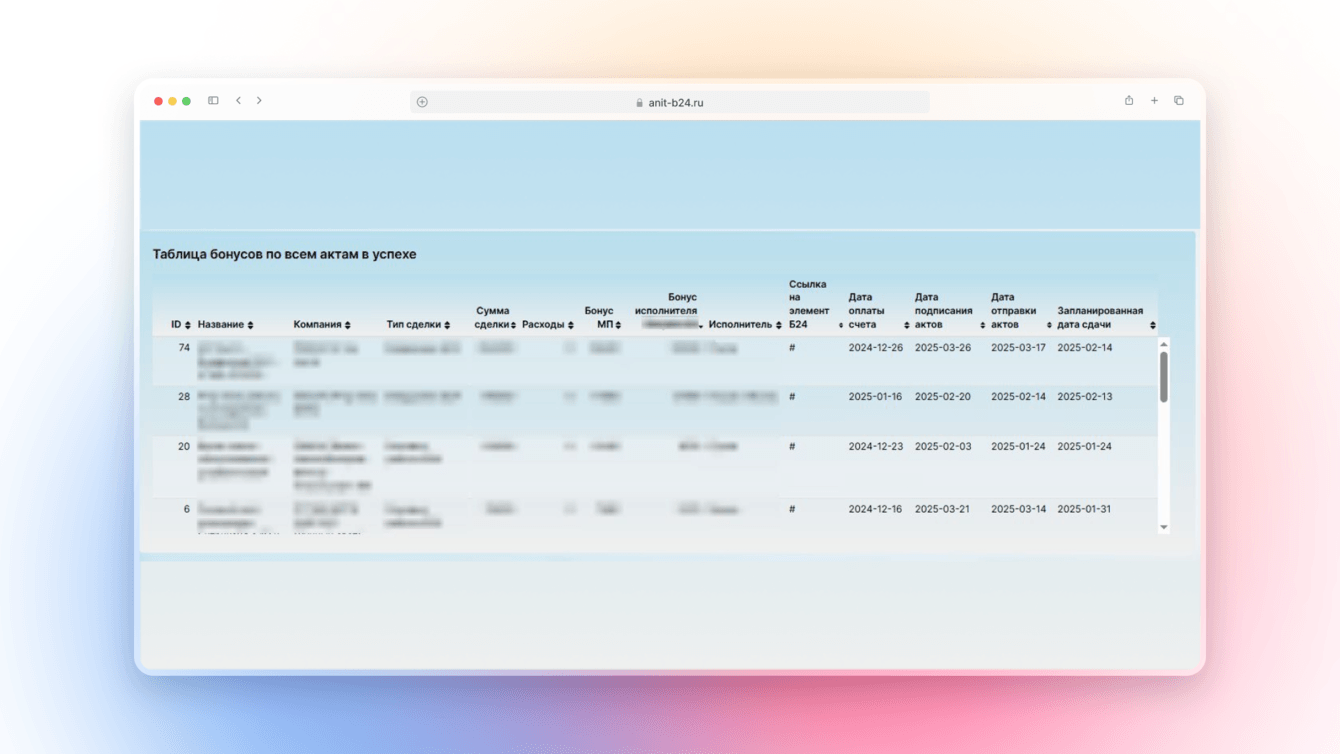 Расчёт происходит автоматически и сохраняется в полях «Бонус механика» и «Бонус адвайзера» в карточке сделки.