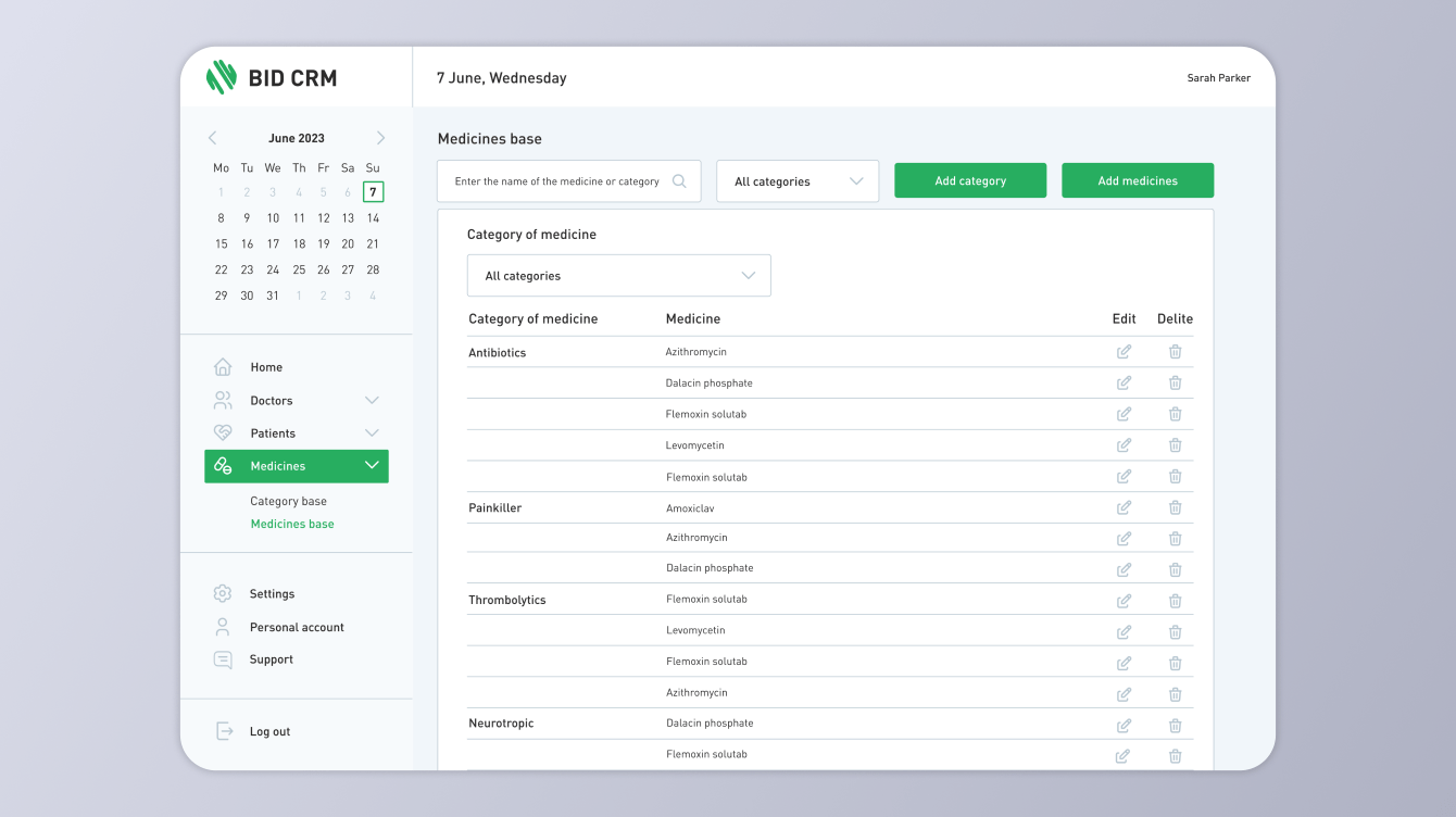 Разработана система добавления медикаментов, с возможностью фильтрации по категориям и привязи медикаментов к определённому приёму.