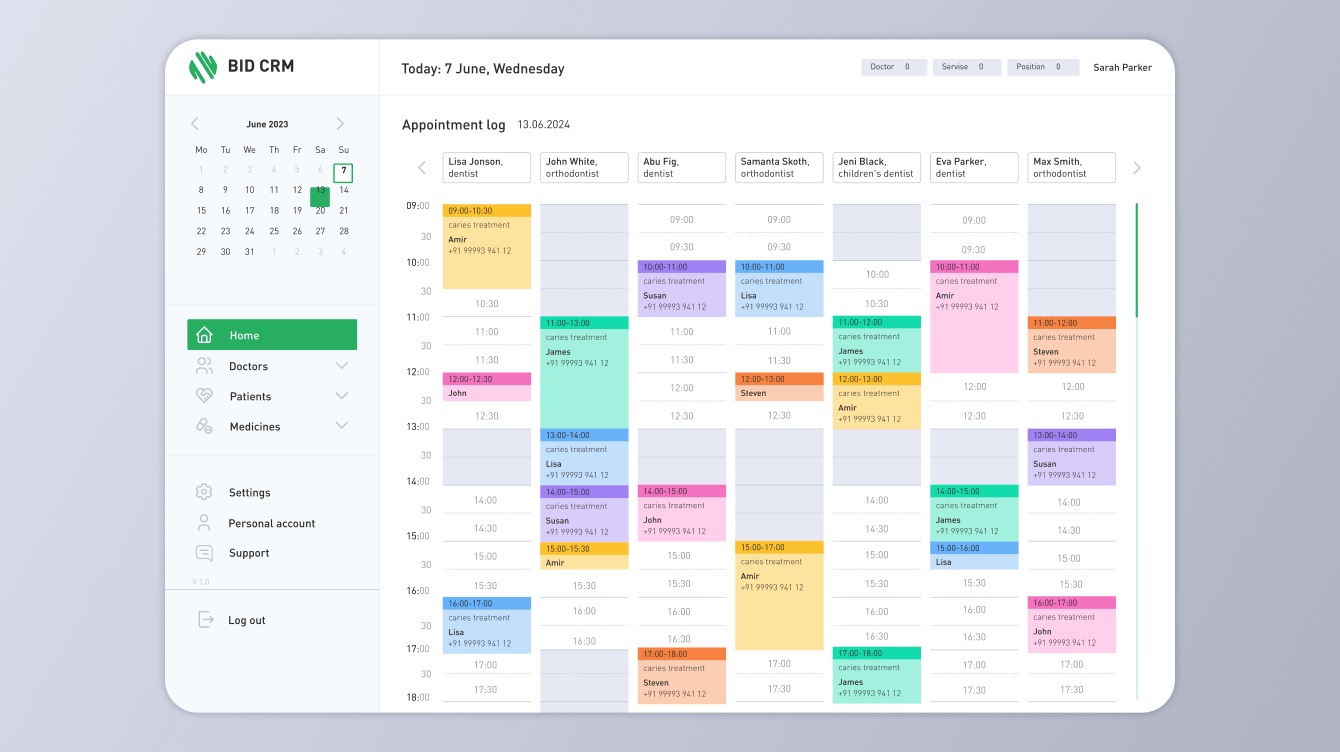 Реализован календарь для отображения записей к врачу с возможностью фильтрации по услуге, по специалисту, по специализации врача.