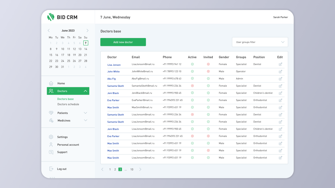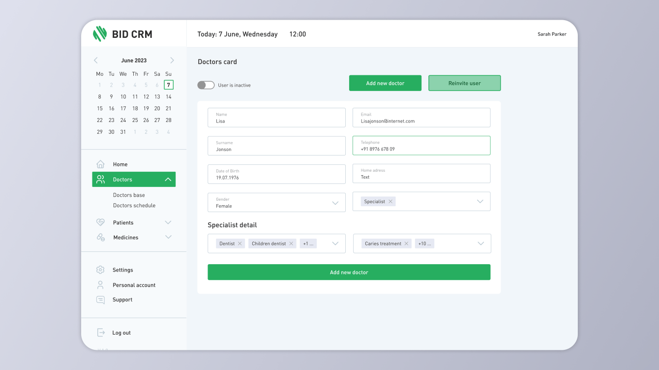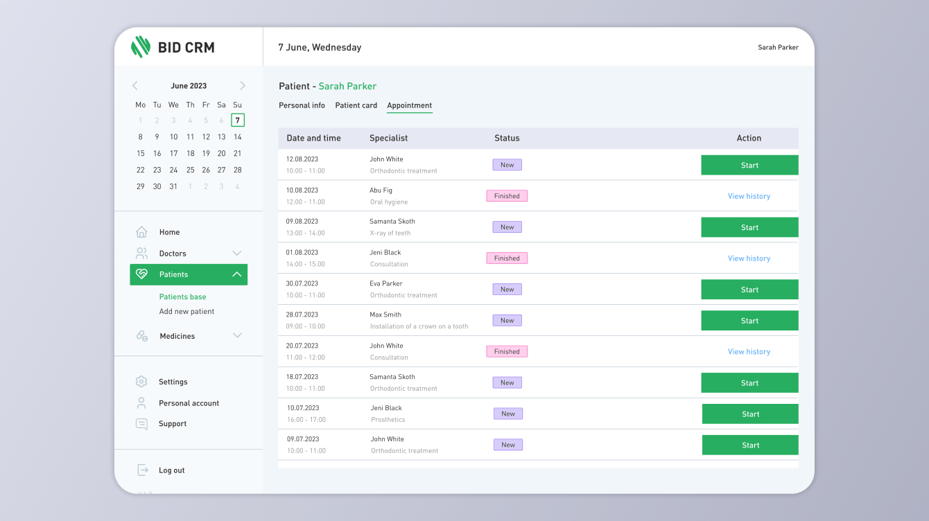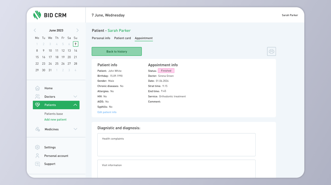 Нашей задачей в рамках этого проекта было разработать CRM (Customer Relationship Management) для медицинских организаций на английском языке. Эта система должна была обеспечить эффективное взаимодействие с пациентами, а также управление расписанием и календарем. Нам также предстояло создать профили врачей и пациентов, независимую базу данных пациентов, настроить различные уровни доступа к информации для врачей, администраторов и владельца. В заключение, мы должны были разработать раздел для учета медикаментов с возможностью добавления и включения их в медицинские заключения.