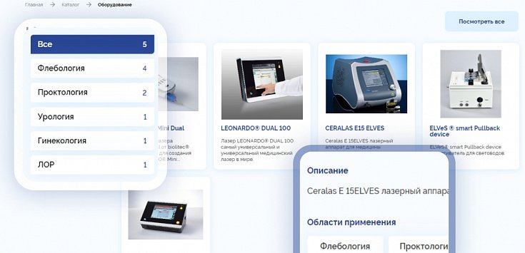 Проект включает в себя витрину предлагаемой продукции (более чем на 15 единиц) – лазерных медицинских аппаратов и комплектующих расходных материалов к ним.